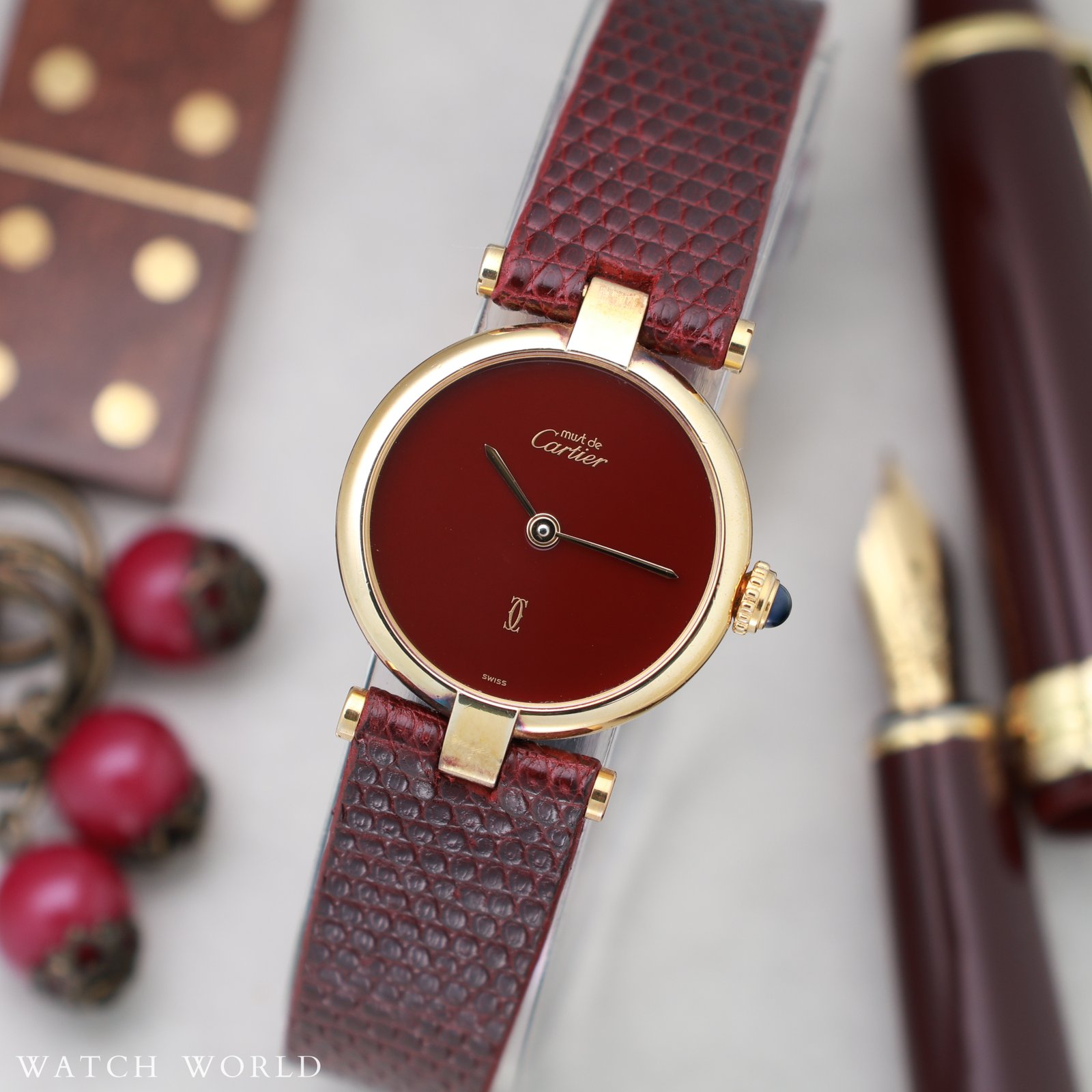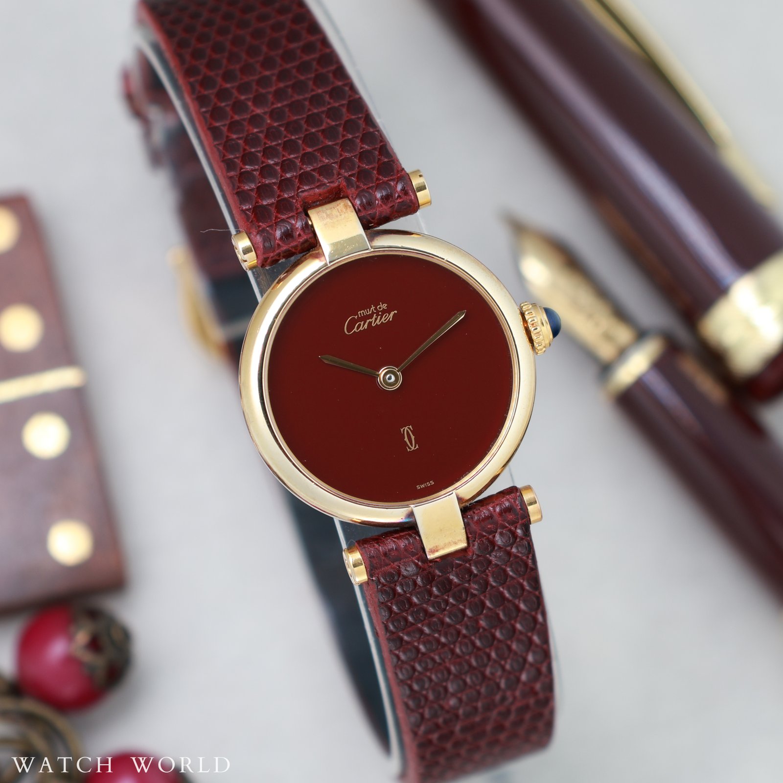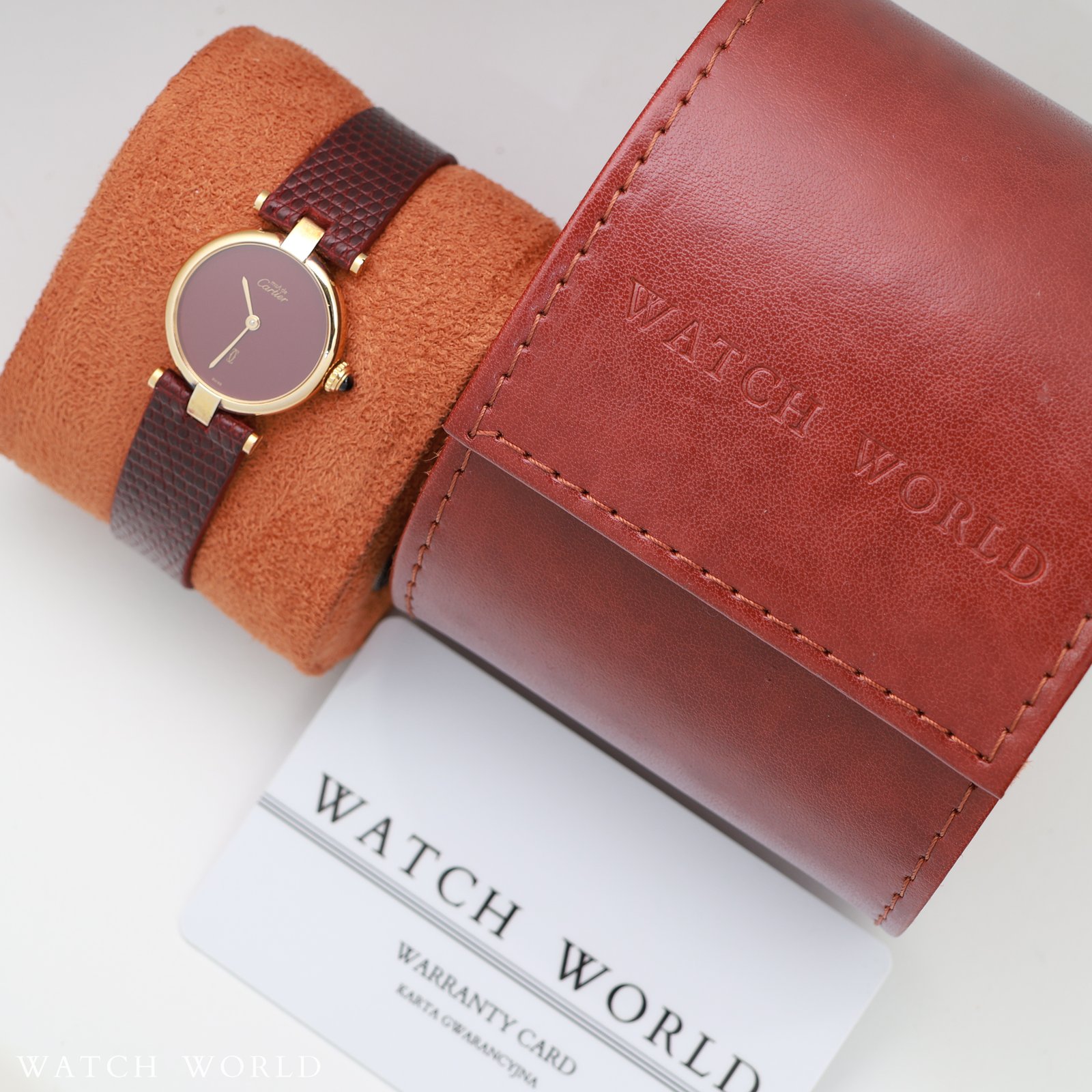Cartier Must De Cartier Burgundy dial to wyjątkowy damski zegarek z lat 90. Przykuwa uwagę piekną tarczą w kolorze burgundowym, co czyni go chętnie kupowanym i poszukiwanym modelem. Oferowany egzemplarz zachowany jest w bardzo dobrym stanie. Koperta w rozmiarze 24mm, wykonana została w technice vermeil, czyli złoconego srebra 925, bez przetarć czy ubytków. Całość dopełniają klasyczne dla Cartiera pozłacane wskazówki. Wewnątrz zegarka pracuje mechanizm kwarcowy Cartier, na dobrym chodzie. Zegarek oferowany jest z nowym skórzanym paskiem oraz klamerką Cartier. Objęty 4 miesięczną gwarancją i dostarczony razem z firmowym etui podróżnym WatchWorld.