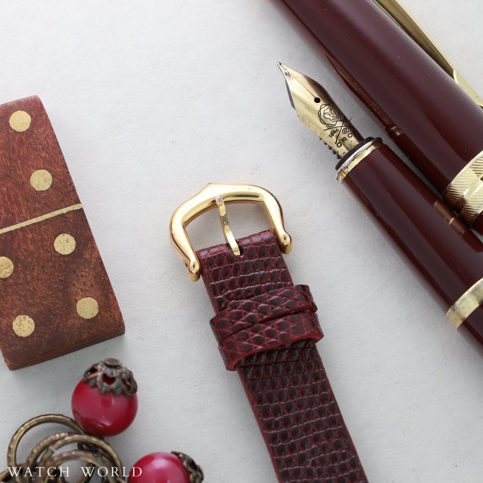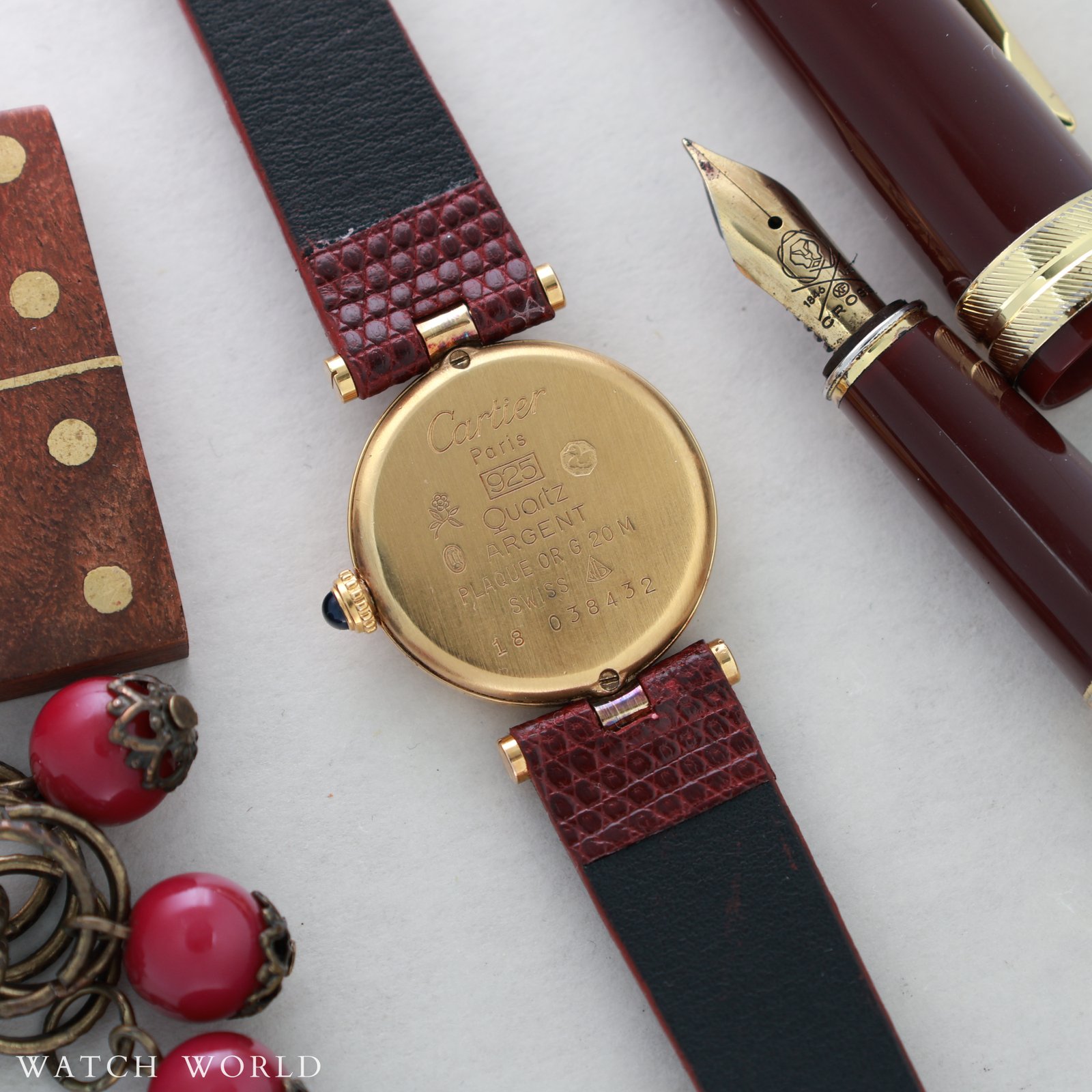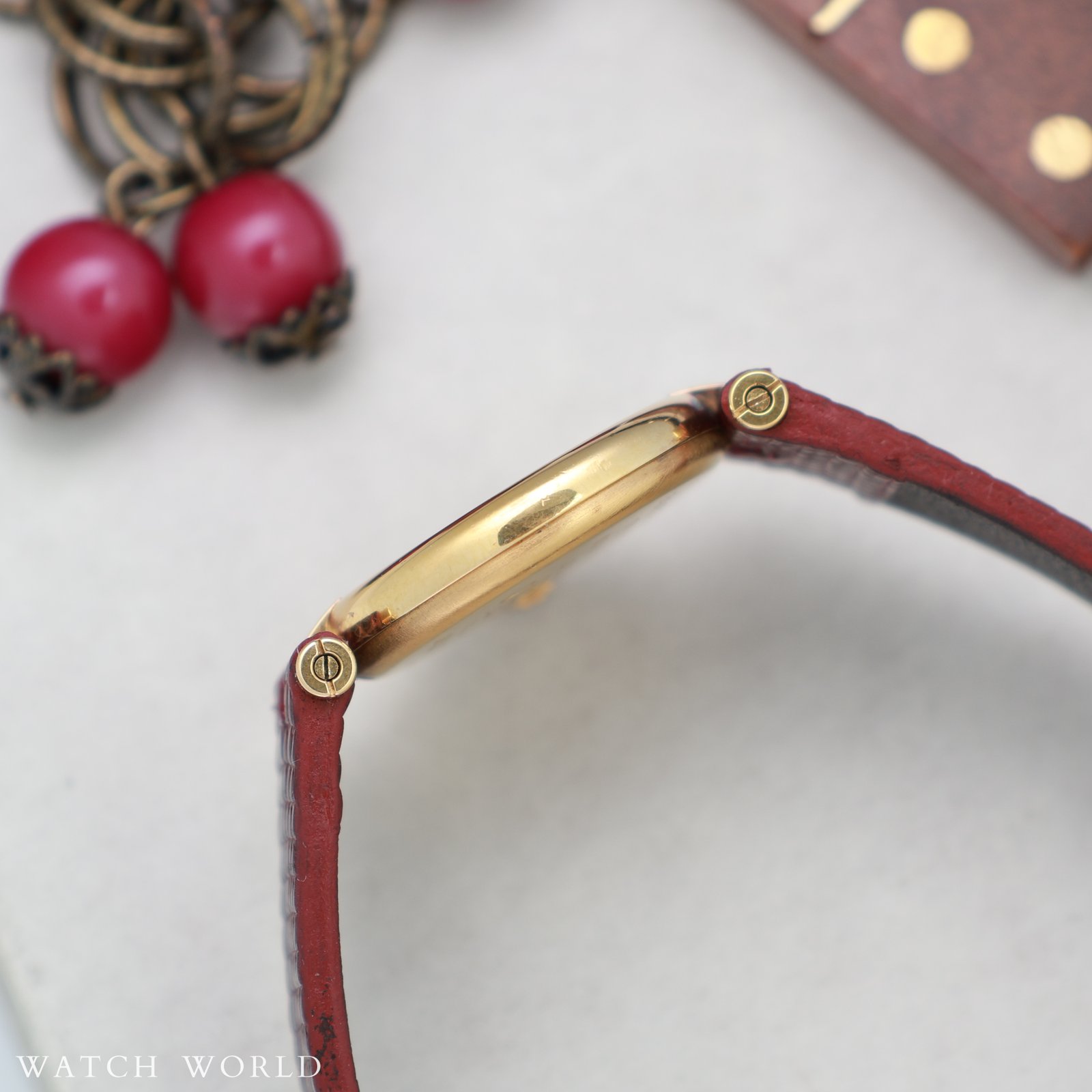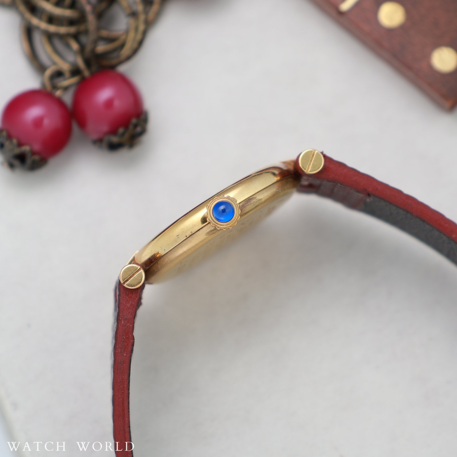 Cartier Must De Cartier Burgundy dial to wyjątkowy damski zegarek z lat 90. Przykuwa uwagę piekną tarczą w kolorze burgundowym, co czyni go chętnie kupowanym i poszukiwanym modelem. Oferowany egzemplarz zachowany jest w bardzo dobrym stanie. Koperta w rozmiarze 24mm, wykonana została w technice vermeil, czyli złoconego srebra 925, bez przetarć czy ubytków. Całość dopełniają klasyczne dla Cartiera pozłacane wskazówki. Wewnątrz zegarka pracuje mechanizm kwarcowy Cartier, na dobrym chodzie. Zegarek oferowany jest z nowym skórzanym paskiem oraz klamerką Cartier. Objęty 4 miesięczną gwarancją i dostarczony razem z firmowym etui podróżnym WatchWorld.