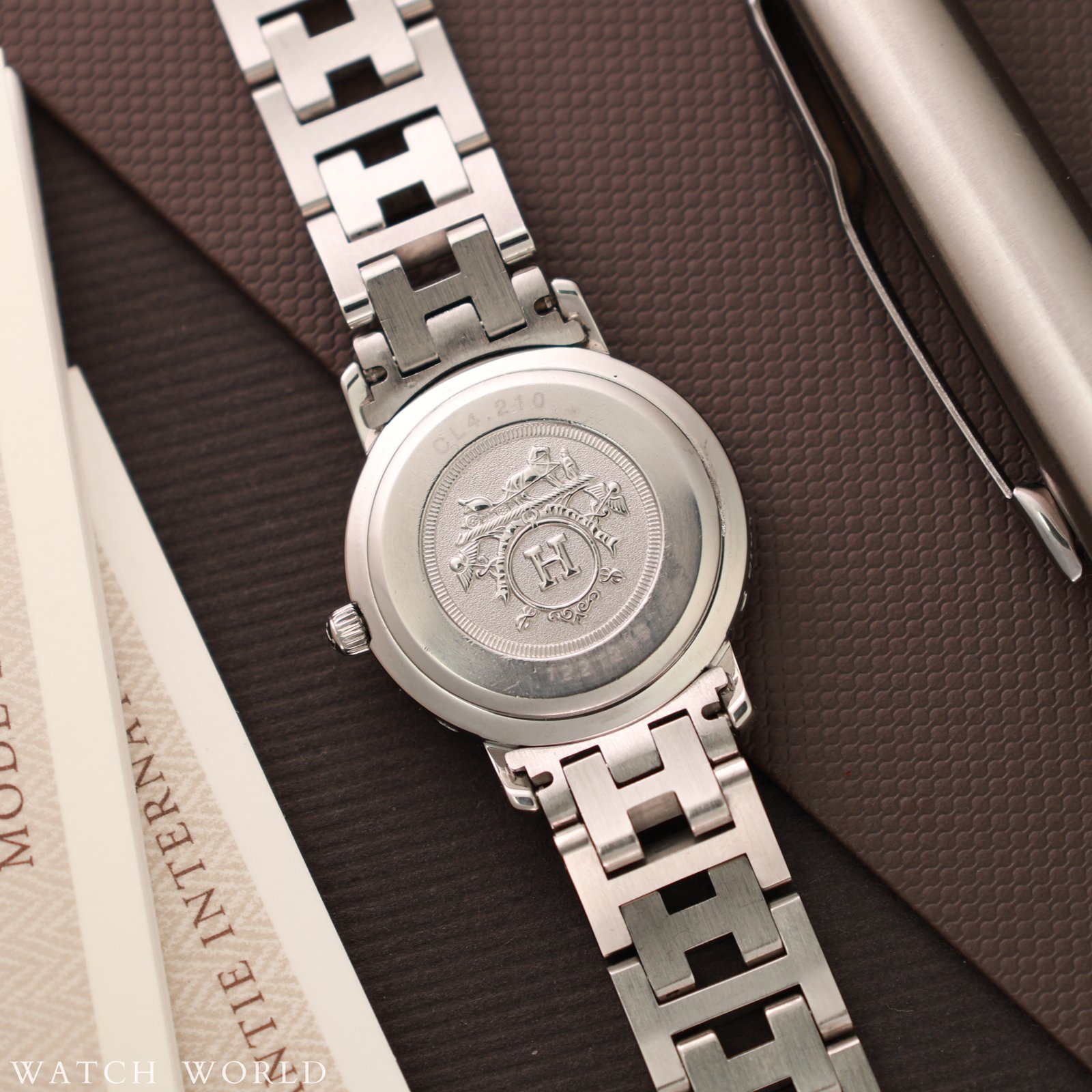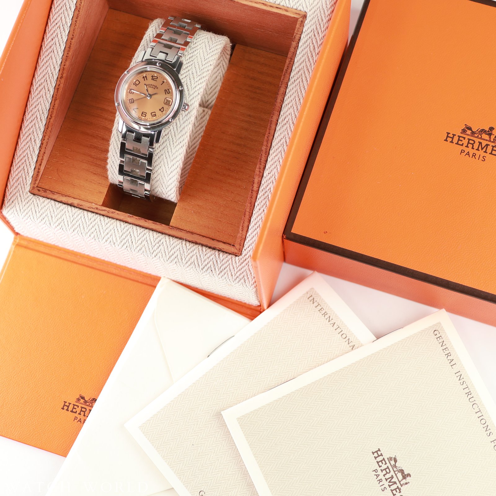 Hermès Clipper Quartz Steel Gold Lady to elegancki zegarek damski, który łączy w sobie francuski szyk i ponadczasowy styl. Koperta o średnicy 24mm wykonana jest ze stali szlachetnej z charakterystycznym designem bezela co czyni go wyjątkowym projektem, szeroko lubianym w środowisku zegarkowym. Tarcza – w odcieniu łososiowym z pięknym szlifem słonecznym z delikatnymi indeksami i wskazówkami a całość chroni szafirowe szkło. Wewnątrz pracuje precyzyjny mechanizm kwarcowy Swiss Made, zapewniający niezawodność i wygodę użytkowania, wyposażony w funkcję centralnej sekundy oraz datownik. Zegarek sprzedawany jest z oryginalna Bransoleta Hermes ze stali nierdzewnej i elementów o długości około 16.5cm. Hermes Clipper Lady to doskonały wybór na każdą okazję. Zegarek objęty jest 4 miesięczną gwarancją sklepu oraz dostarczony jest razem oryginalnymi papierami i pudełkiem. Zegarek z 2001 roku.
