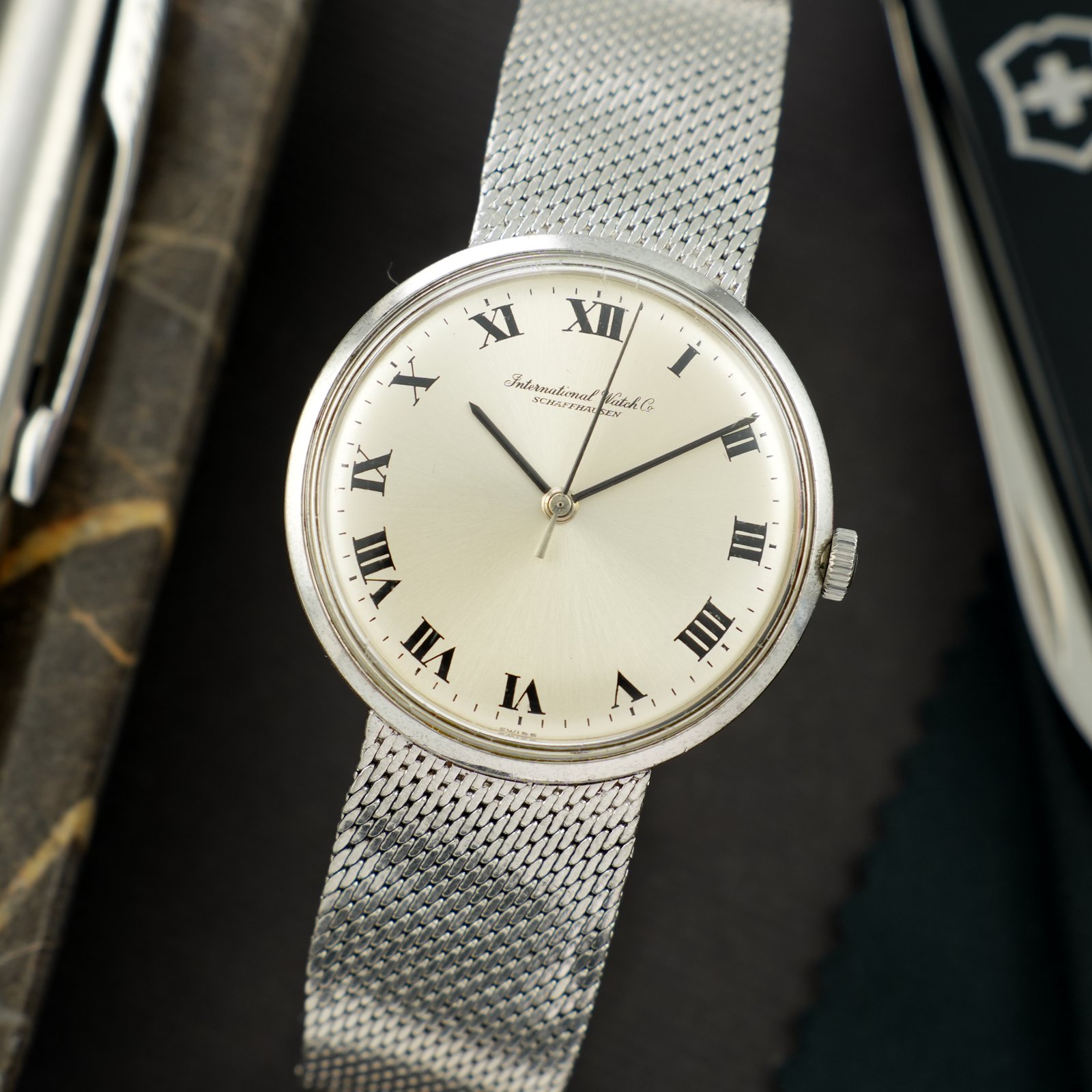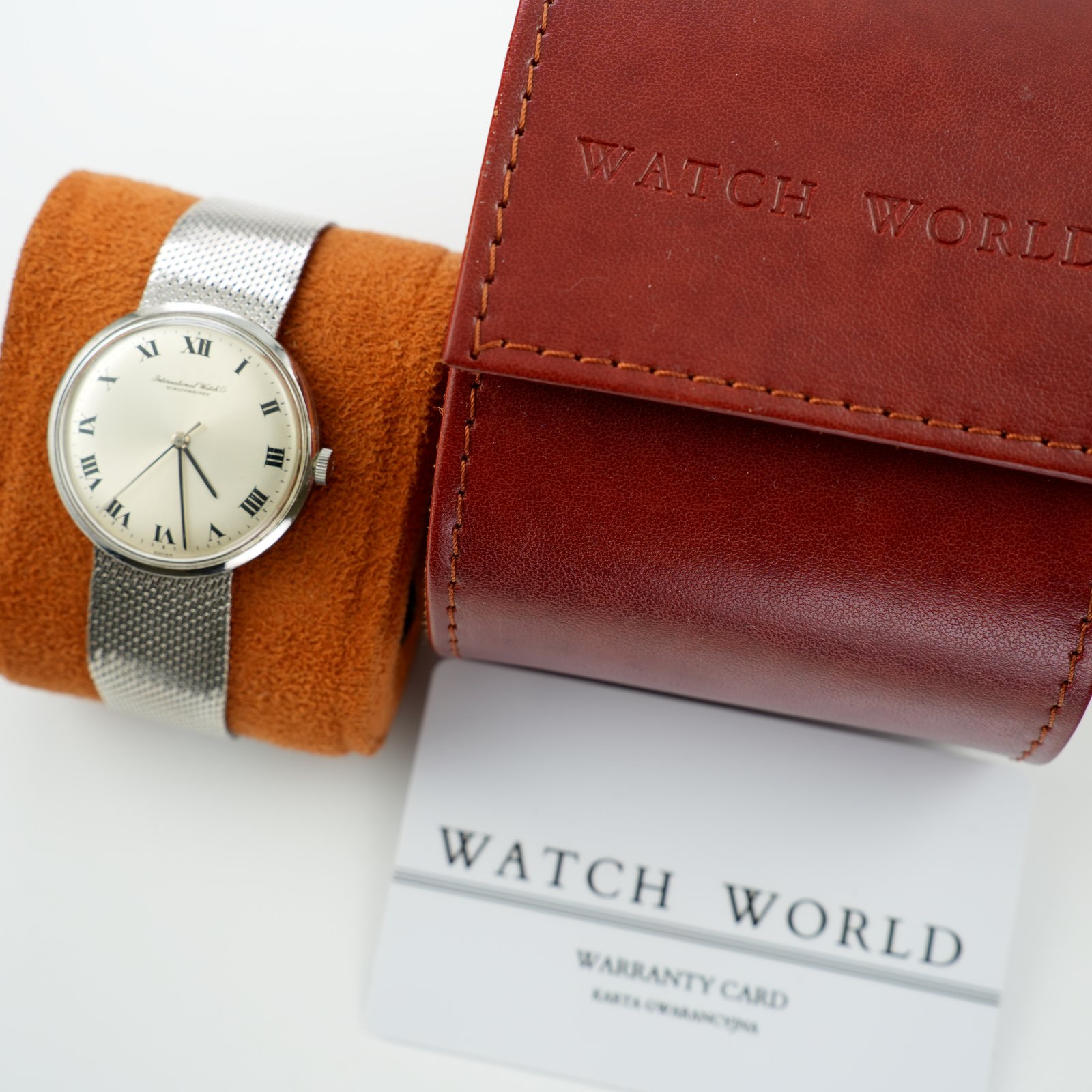 IWC Schaffhausen ref. 2400 cal. 403 to wyjątkowy model z lat 70, reprezentujący jedną z najlepszych szwajcarskich manufaktur z tamtego okresu. Piękna srebrna tarcza ze szlifem słonecznym uzupełniona została rzymskimi indeksami i lakierowanymi czarnymi wskazówkami. Całość wyróżnia się na nadgarstku, przykuwa spojrzenie i jest jedną z najrzadziej spotykanych wersji tej referencji. Koperta w rozmiarze 35mm, zajmująca dużą część powierzchni, co optycznie powiększa odbiór zegarka na nadgarstku. W środku pracuje ręcznie nakręcany mechanizm IWC cal. 403, na dobrym chodzie. Zegarek sprzedawany razem z oryginalną zintegrowaną bransoletą typu mesh. Całość zachowana w dobrym jak na wiek stanie, w pełni oryginalnym. Dekiel posiada zarysowania jednak nie są one głębokie. Na zegarek obowiązuje 4 miesięczna gwarancja a dostarczony jest razem z firmowym etui podróżnym WatchWorld.
