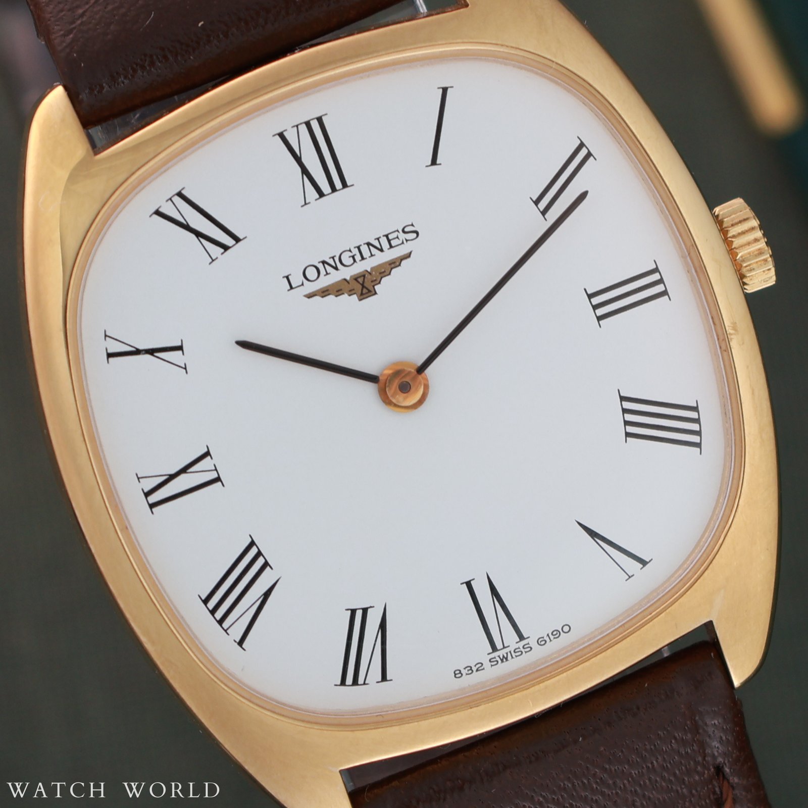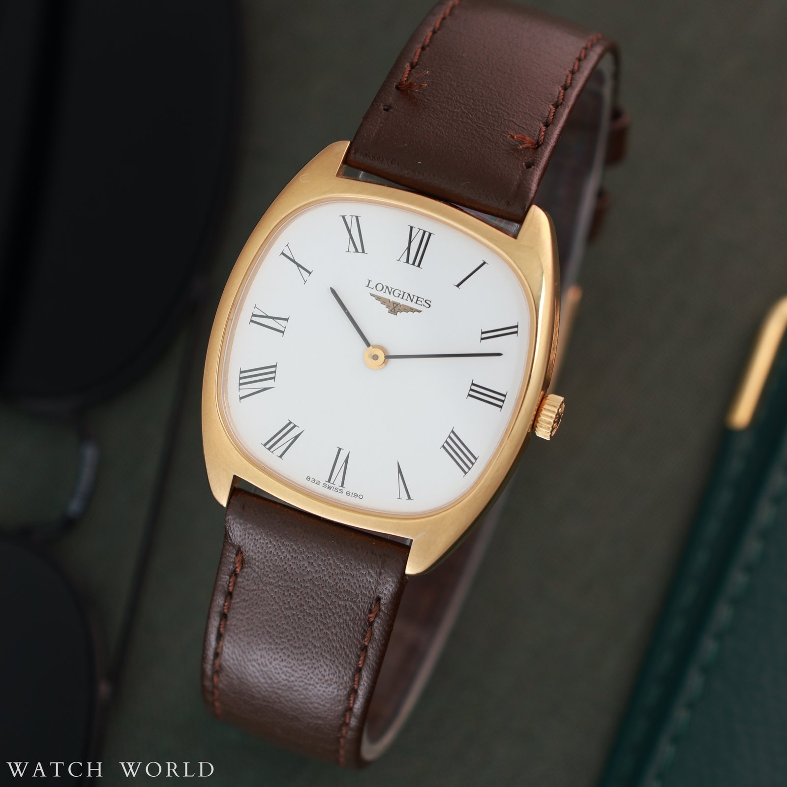 Ciekawy Longines w pozłacanej kopercie typu kostka/tank z lat 70. Prezentowany zegarek jest w oryginalnej bardzo dobrej kondycji – wyposażony jest nadal w fabryczny pasek z pozłacaną klamerką Longines. Koperta w rozmiarze 30mm x 35mm zwraca uwagę rzymskimi indeksami, które dodają całości elegancji i charakteru. Oryginalna sygnowana koronka i szkło. W środku pracuje znany manualny mechanizm Longines kaliber 847 słynący z bezawaryjnej pracy. Parametry chodu w normie, technicznie zegarek działa poprawnie. Cała oferta objęta jest 4 miesięczną gwarancją sklepu oraz dostarczona w firmowy etui podróżnym WatchWorld.