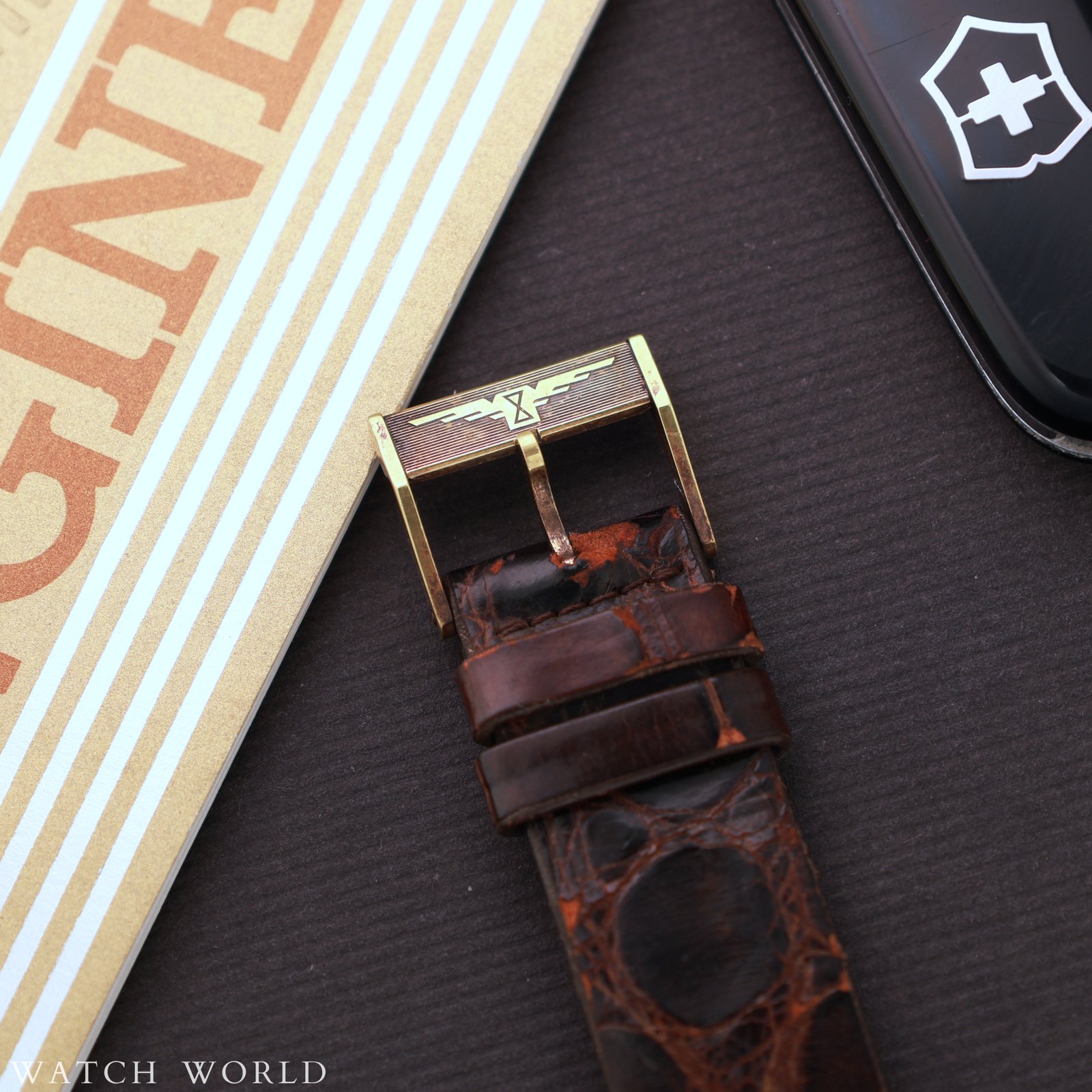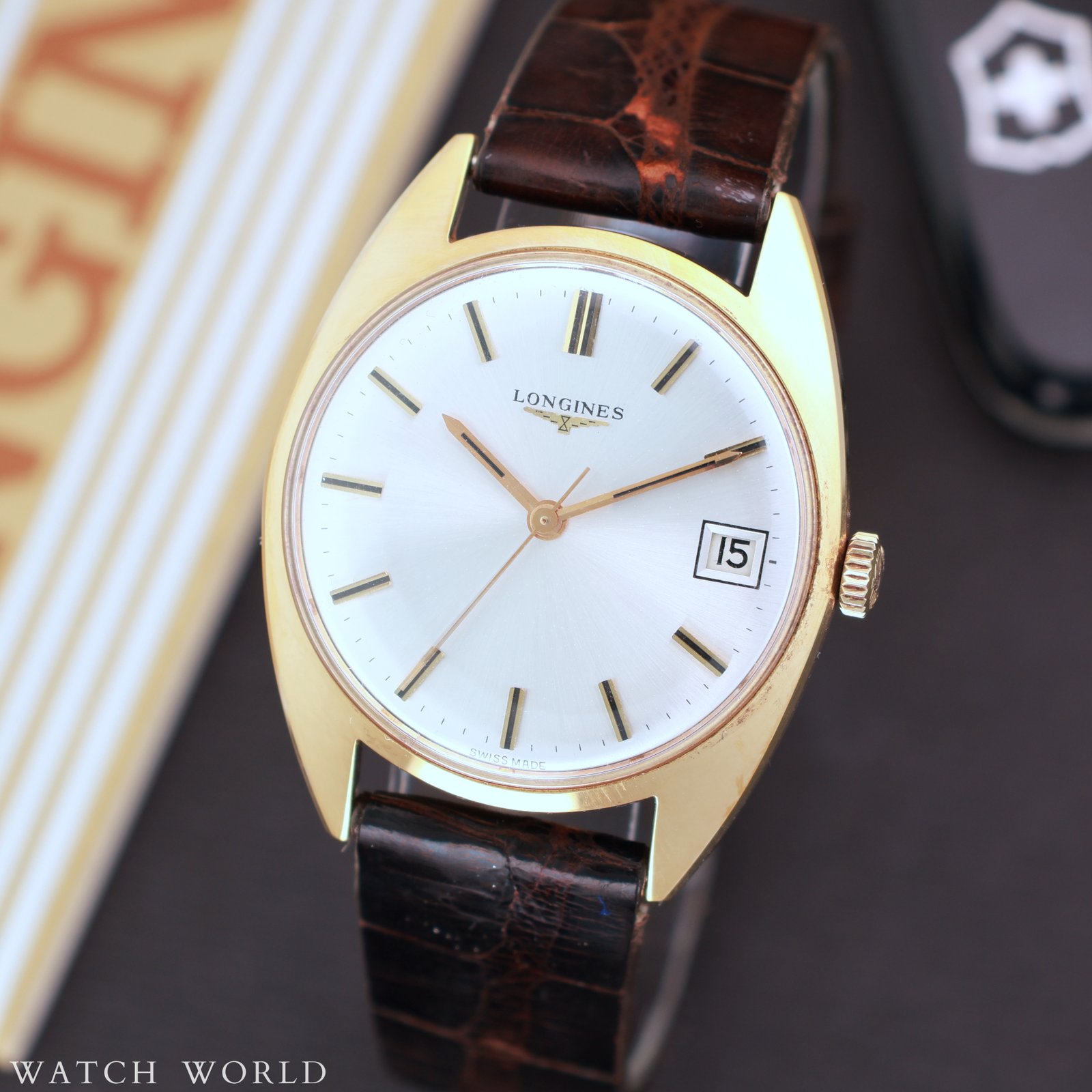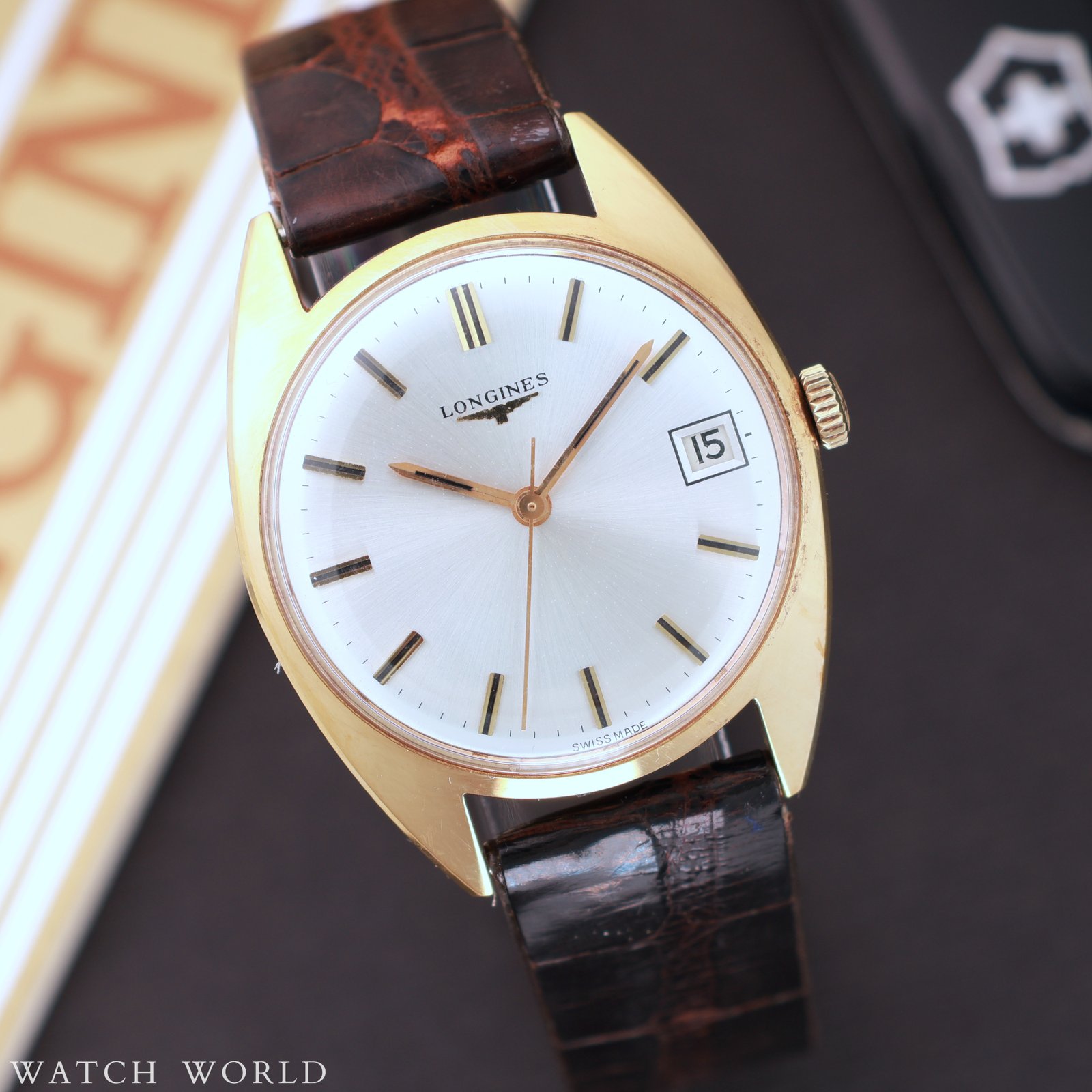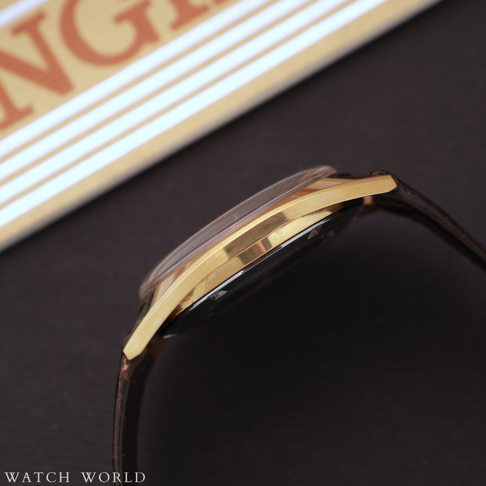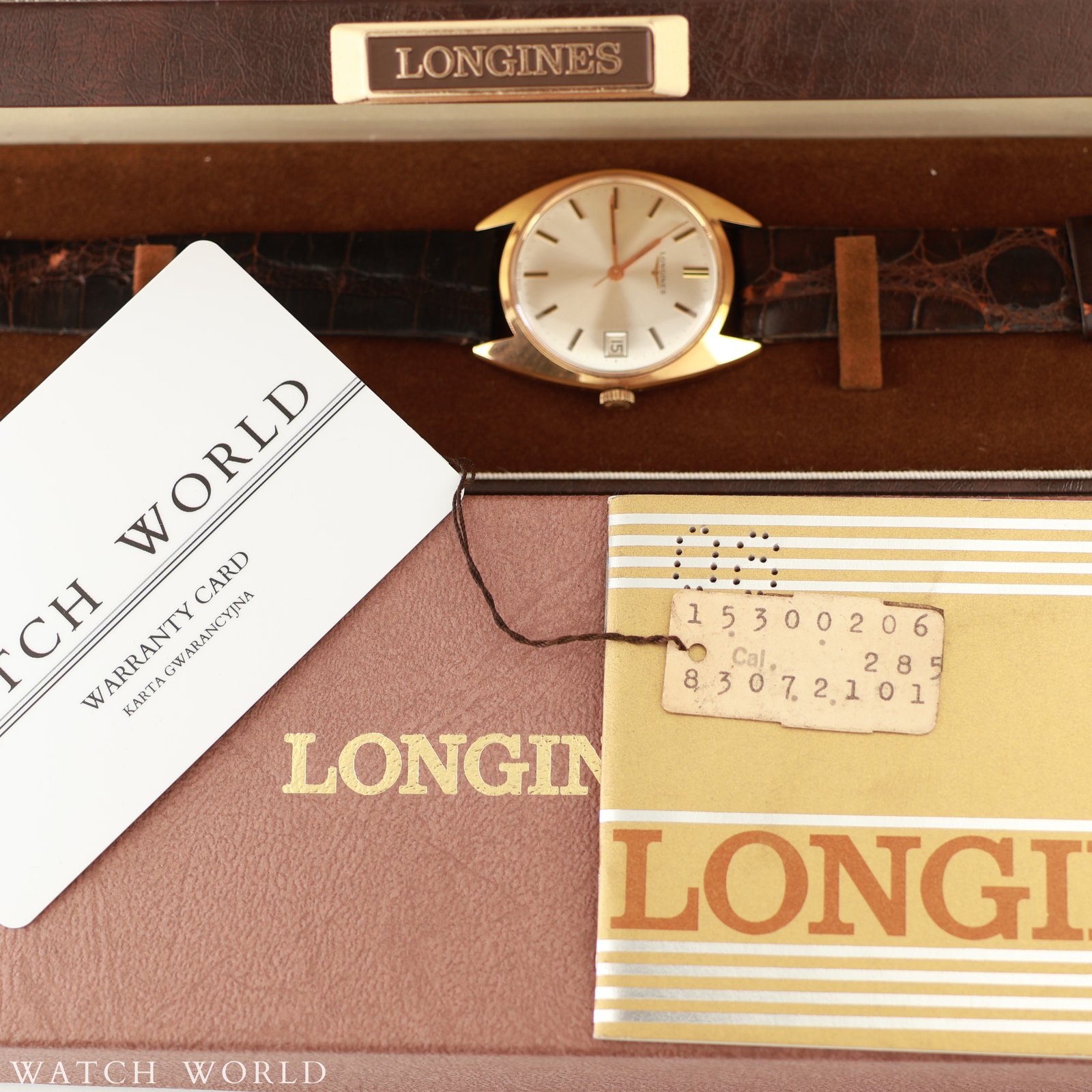 Longines ref. 7913 cal. 286 Tonneau to elegancki, vintage’owy zegarek o charakterystycznej beczułkowatej kopercie z końca lat 60. Zegarek zachowany jest w nieużywanym stanie, koperta w rozmiarze 35mm bez koronki nadal ma pełną powłokę złocenia, bez przetarć czy przejaśnien. Eleganckiego charakteru nadaje tarcza w kolorze szampańskim razem z indeksami i wskazówkami w kolorze złota, z czarnym wypełnieniem. Logowana koronka, oryginalne szkło. W środku zegarka pracuje ręcznie nakręcany mechanizm Longines cal. 286, świeżo po serwisie zegarmistrzowskim. Zegarek wyposażony jest w oryginalny skórzany pasek z pewnymi uszkodzeniami, dość sztywny, oraz w oryginalne złocenie zapięcie z charakterystyczną skrzydlatą klepsydrą symbolem marki. Zestaw tworzy zegarek, oryginalne papiery sprzedażowe, zawieszka oraz pudełko, wewnętrzne i zewnętrzne. Zegarek objęty 12 miesięczną gwarancją WatchWorld.