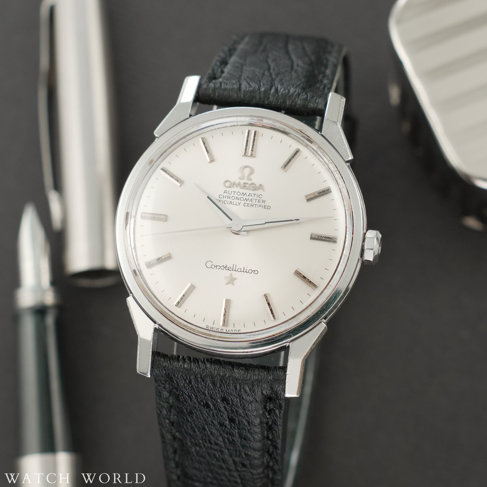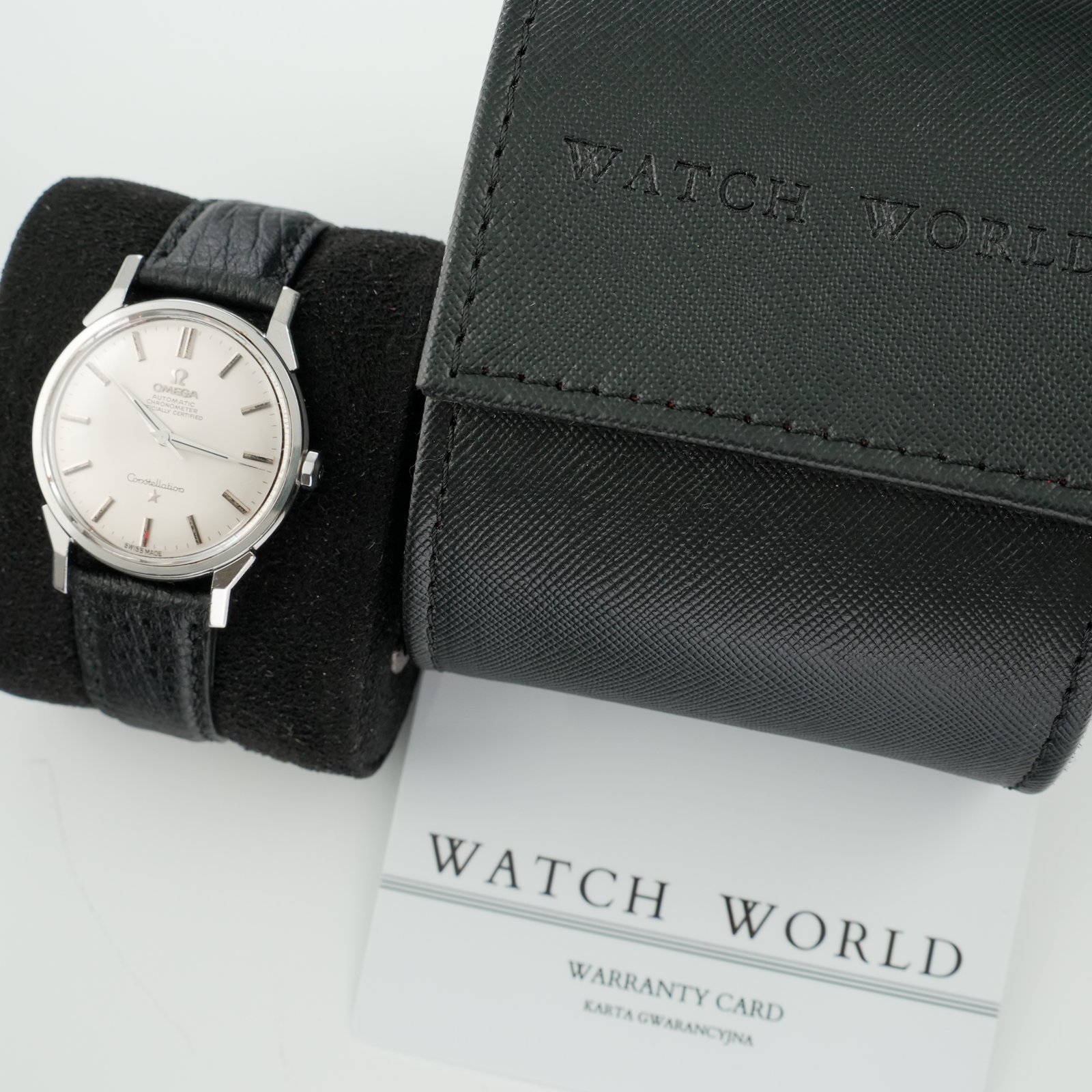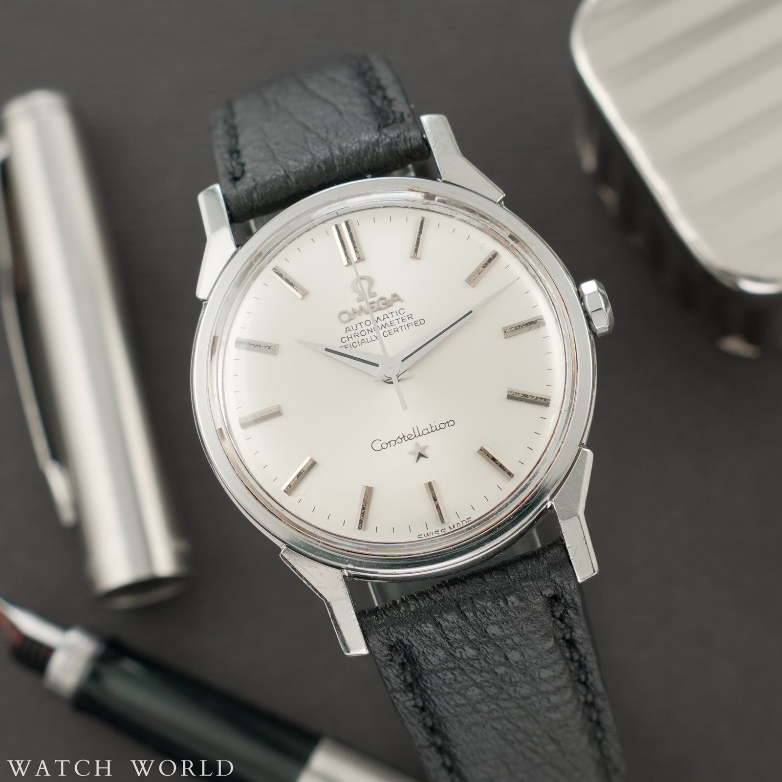 Omega Constellation ref. 168.005 cal. 561 to jeden z najbardziej poszukiwanych modeli vintage, ceniony przez rzesze zegarkowych pasjonatów na całym świecie. Ikoniczny design Geralda Genty – koperta z uszami typu dog legs z charakterystyczną koronką. Rozmiar 34mm, zachowany w bardzo dobrym stanie, oryginalne szlify. Całość uzupełnia piękna srebrna tarcza ze szlifem słonecznym. Wysokie wąskie indeksy i wskazówki typu dauphine, logowana koronka i szkiełko. W środku zegarka pracuje niezawodny mechanizm automatyczny Omega cal. 561, świezo po pełnym serwisie zegarmistrzowskim. Zegarek sprzedawany jest na nowym skórzanym pasku ze skóry strusia. Oferta objęta jest 12 miesięczną gwarancją WatchWorld oraz dostarczona z firmowym etui podróżnym. Omega Constellation dog legs to dla wielu must have i zegarek który nie schodzi z ręki.