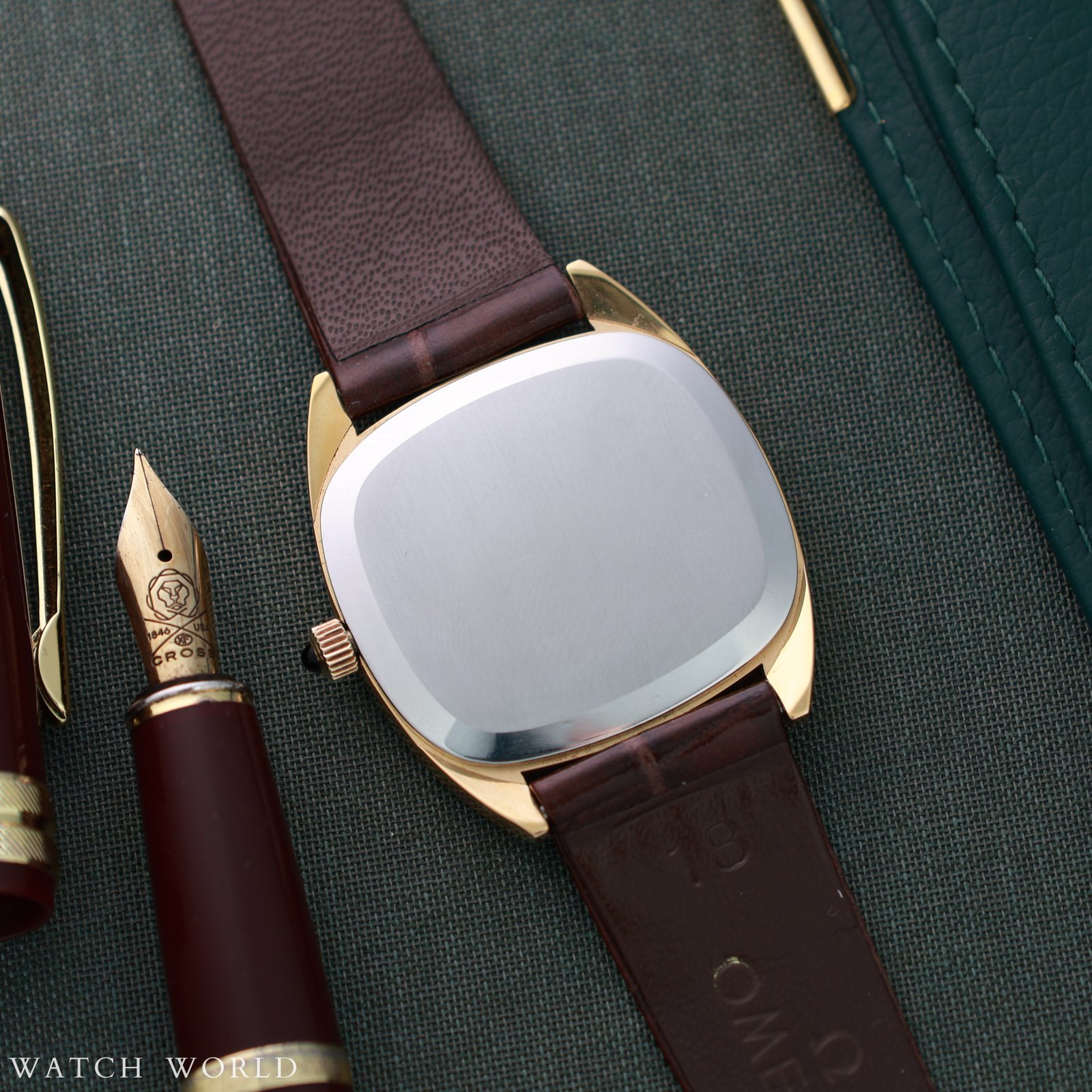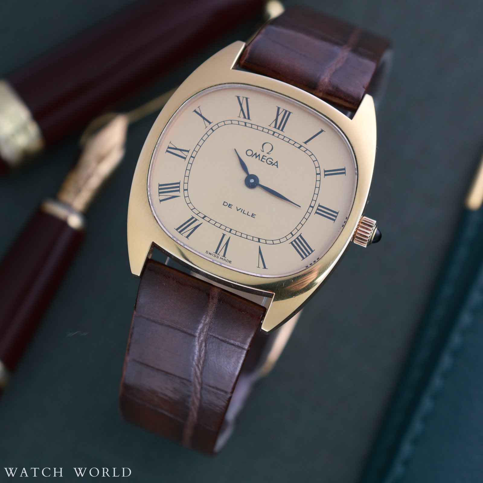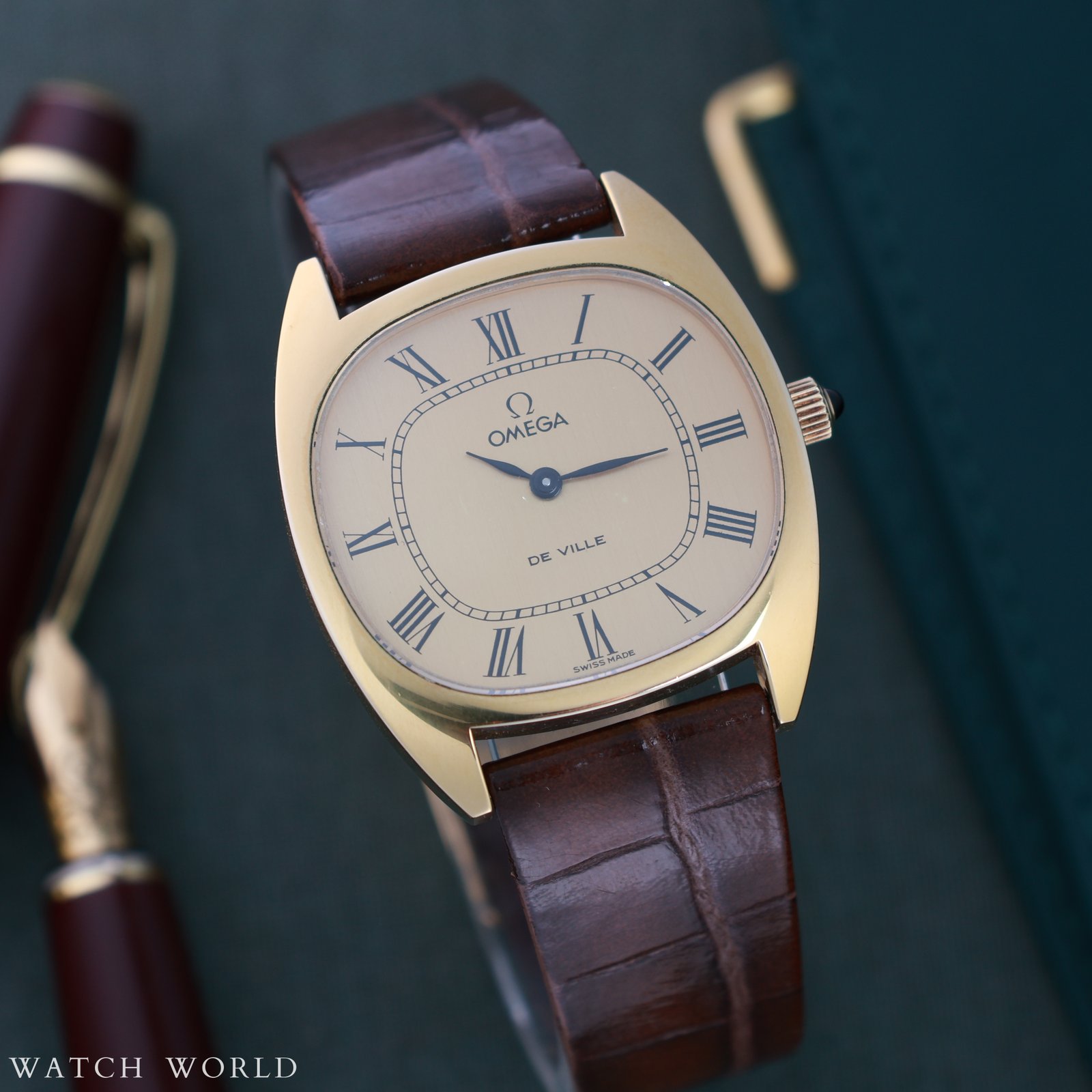 Omega De Ville Ref. 111.0132 cal. 625 to wyjątkowy przykład minimalizmu z subtelnym wyrafinowaniem lat 70. Koperta w charakterystycznym eliptycznym kształcie w rozmiarze 32mm wykonana została ze stali nierdzewnej, pozłacana, imponuje smukłością i ponadczasowym wyglądem. Dodatkowym wyróżniającym się elementem jest tarcza z rzymskimi indeksami, w kolorze złotym, i uzupełniającymi całość wskazówkami. Zegarek posiada oryginalne logowane szkło i koronkę wykończoną ozdobnym kaboszonem. W środku pracuje niezawodny ręcznie nakręcany mechanizm Omega cal. 625. Całość oferowana jest razem z oryginalnym skórzanym paskiem i złoconą klamerką. Zegarek objęty jest 12 miesięczną gwarancją WatchWorld oraz dostarczony w firmowym etui podróżnym.