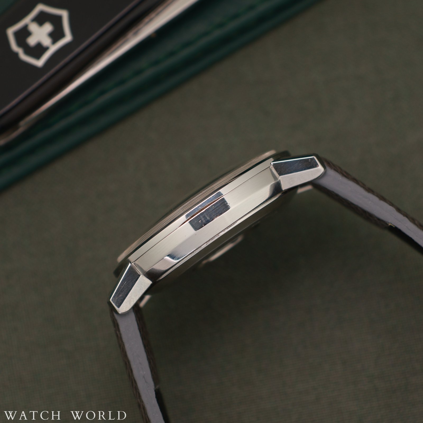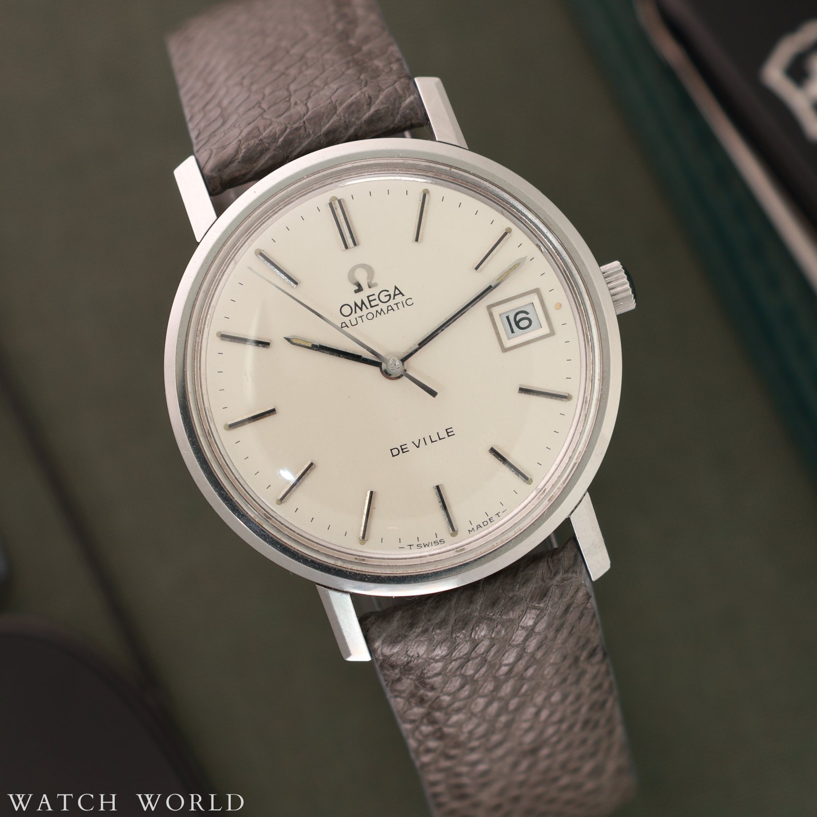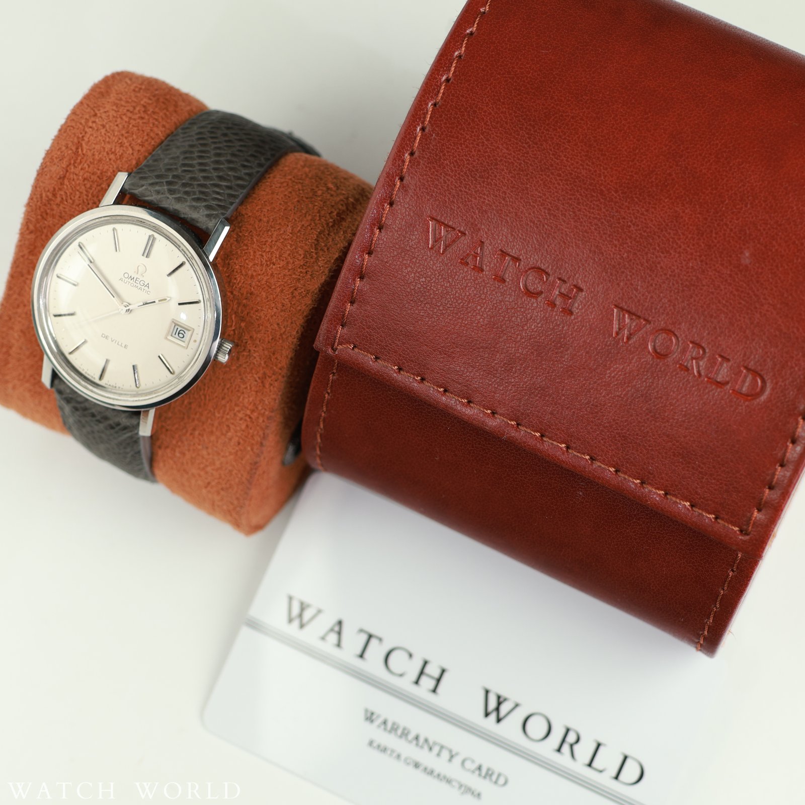 Omega De Ville 166.033 to klasyczny zegarek vintage z początku lat 70, charakteryzujący się eleganckim, klasycznym designem. Koperta w rozmiarze 35mm wykonana jest ze stali szlachetnej, zachowana w pięknej oryginalnej kondycji. Tarcza srebrna z nakładanymi indeksami godzinowymi oraz prostyki wskazówkami typu baton. Sercem zegarka jest automatyczny mechanizm cal. 565 znany z wysokiej precyzji i niezawodności działania. Mechanizm świeżo po serwisie. Całość oferowana jest na skózanym ręcznie robionym pasku w kolorze grafitowym. Ponadto zegarek posiada oryginalną logowaną koronkę oraz oryginalne logowane szkło akrylowe. Oferta objęta jest 12 miesięczną gwarancją WatchWorld oraz dostarczony w firmowym etui podróżnym.