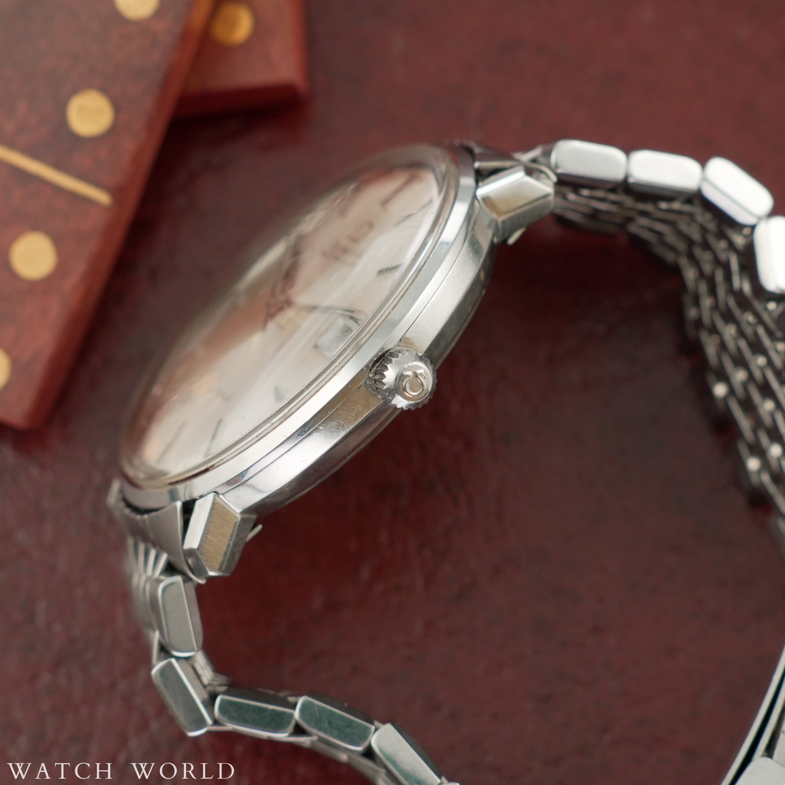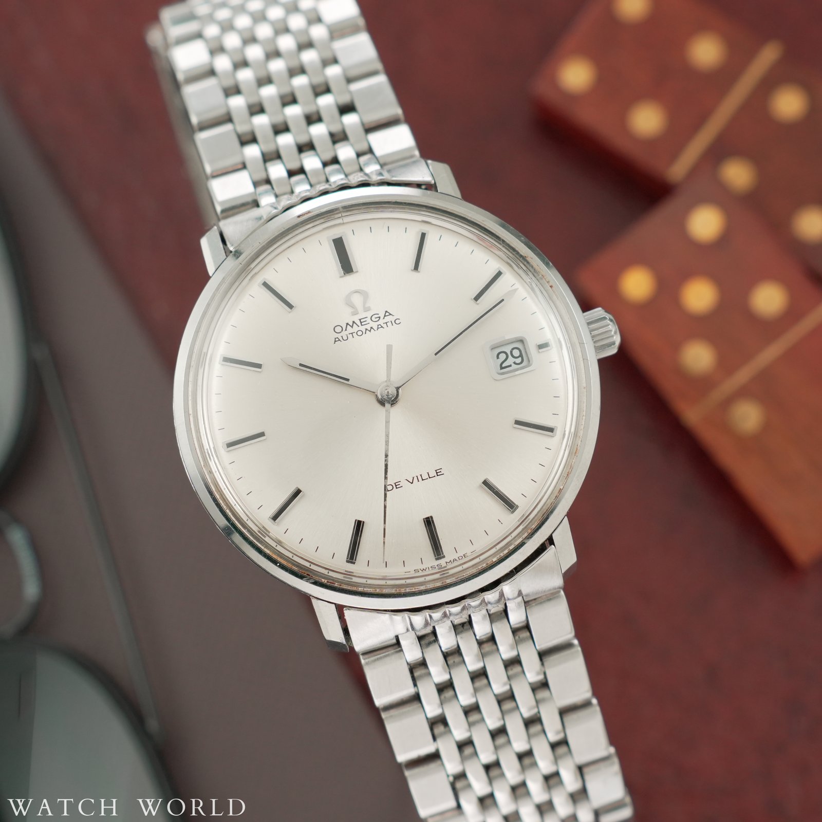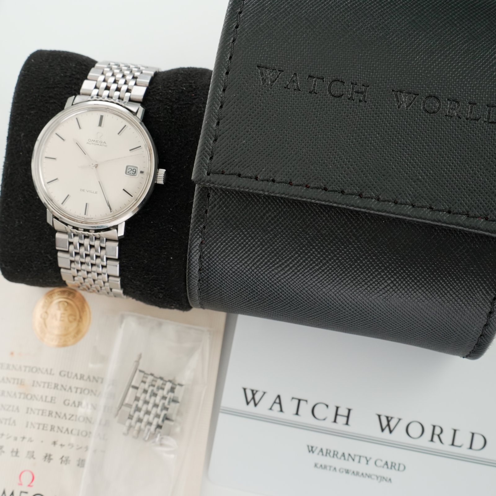 Omega Deville 166.033 cal. 565 to klasyczny zegarek vintage z początku lat 70, charakteryzujący się eleganckim, klasycznym designem. Koperta w rozmiarze 35mm wykonana jest ze stali szlachetnej, zachowana w pięknej oryginalnej kondycji. Tarcza srebrna z nakładanymi indeksami godzinowymi oraz prostyki wskazówkami typu baton. Sercem zegarka jest automatyczny mechanizm cal. 565 znany z wysokiej precyzji i niezawodności działania, świeżo po pełnym serwisie zegarmistrzowskim. Całość oferowana jest na oryginalnej bransolecie typu beads of rice z płaskimi ogniwami, tzw. flat links. Rozmiar maksymalny 20cm. Ponadto zegarek posiada oryginalną logowaną koronkę oraz oryginalne logowane szkło akrylowe. Oferta objęta jest 12 miesięczną gwarancją WatchWorld oraz dostarczony w firmowym etui podróżnym. Całość uzupełnia pierwotny dokument gwarancyjny, data sprzedaży 1969 rok co podkreśla jego kolekcjonerską wartość.