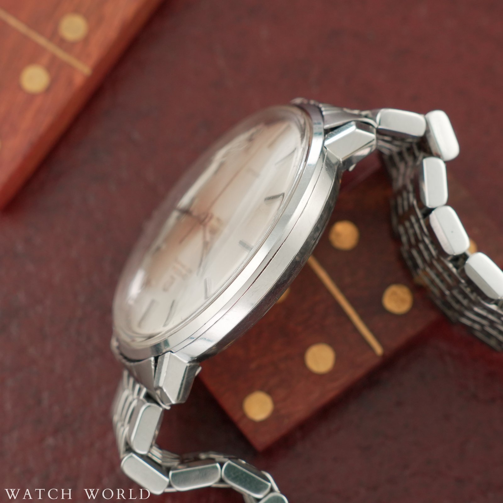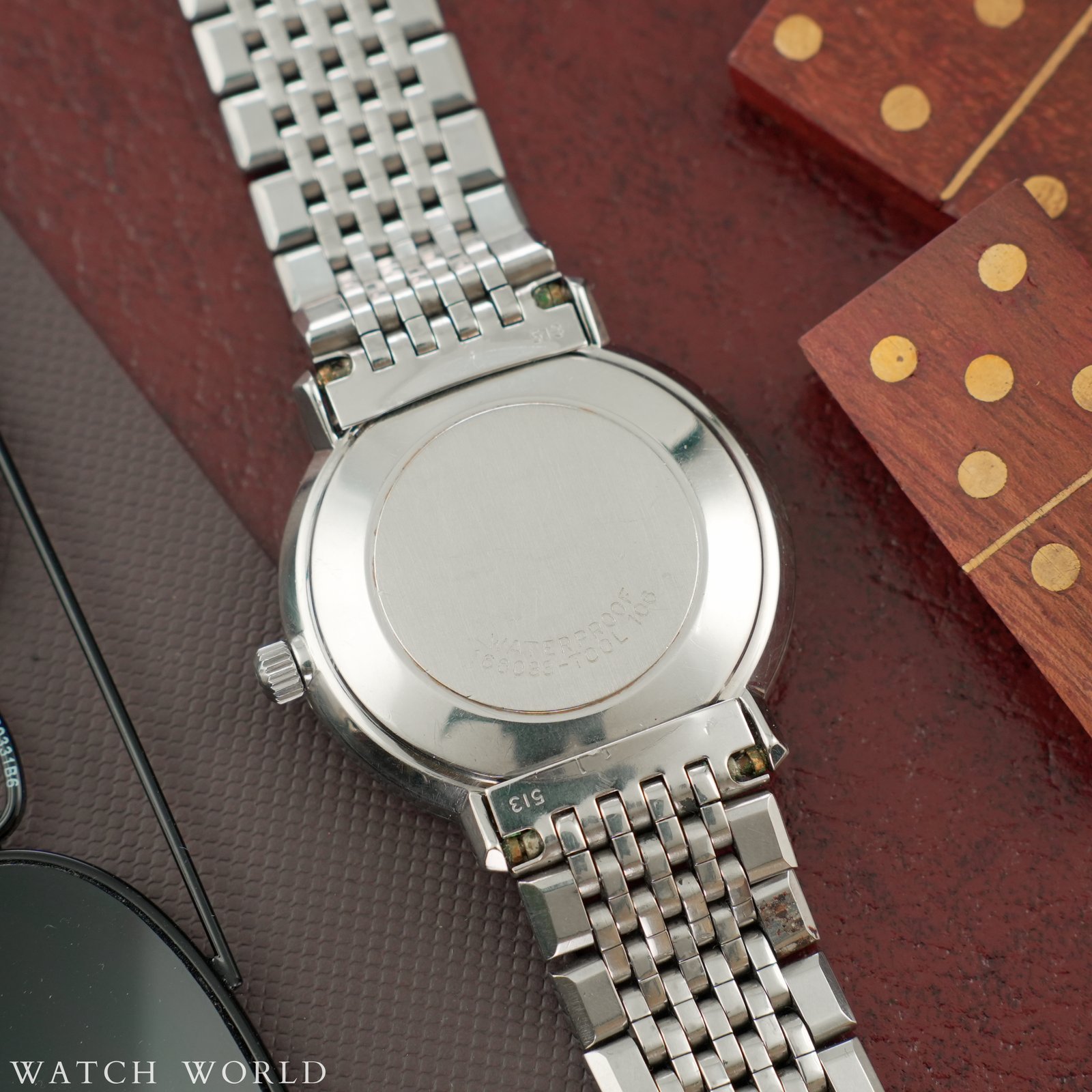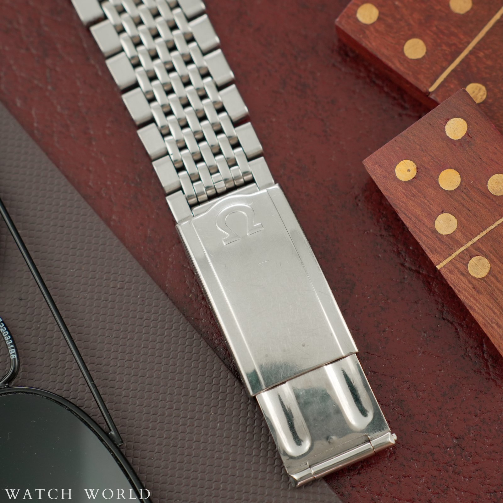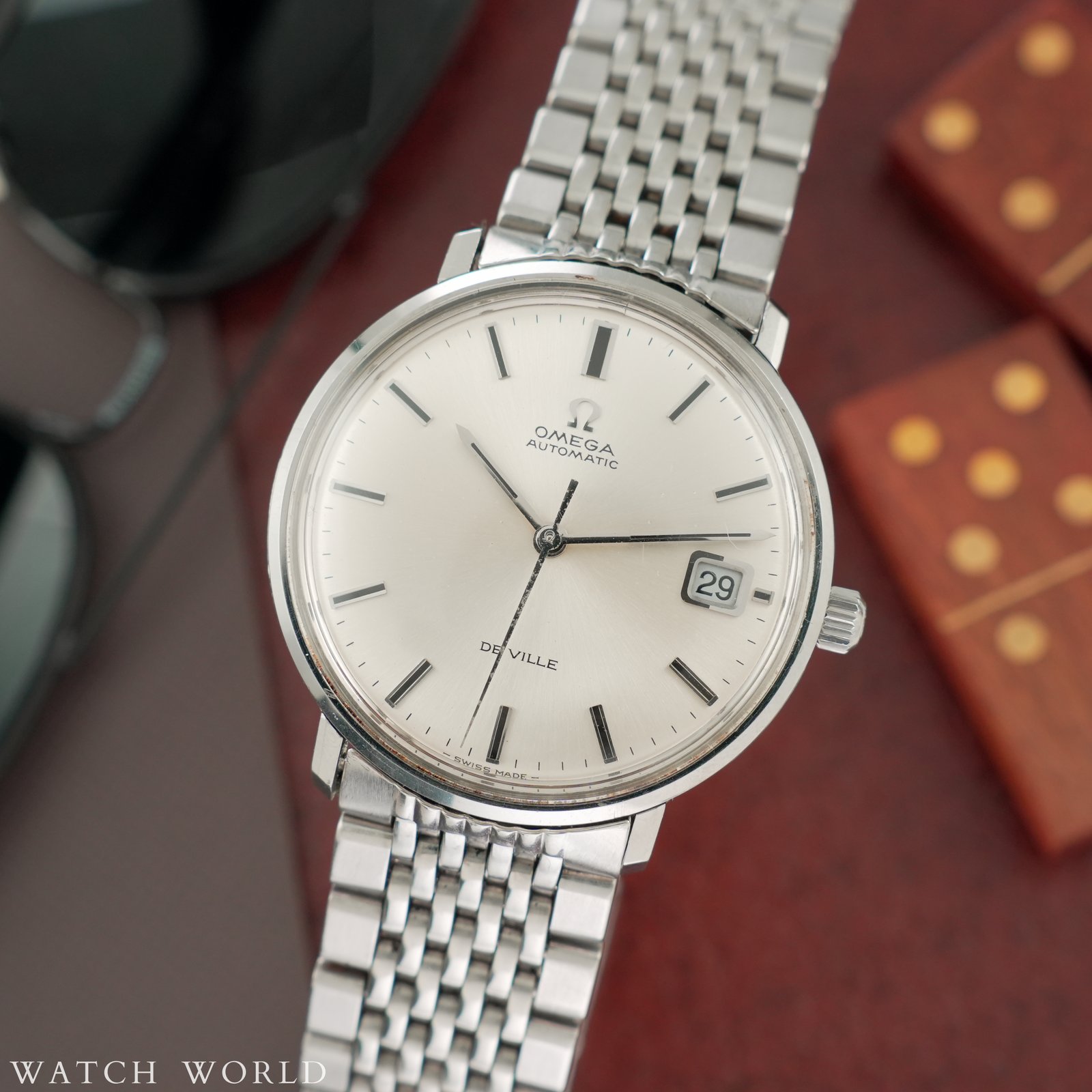 Omega Deville 166.033 cal. 565 to klasyczny zegarek vintage z początku lat 70, charakteryzujący się eleganckim, klasycznym designem. Koperta w rozmiarze 35mm wykonana jest ze stali szlachetnej, zachowana w pięknej oryginalnej kondycji. Tarcza srebrna z nakładanymi indeksami godzinowymi oraz prostyki wskazówkami typu baton. Sercem zegarka jest automatyczny mechanizm cal. 565 znany z wysokiej precyzji i niezawodności działania, świeżo po pełnym serwisie zegarmistrzowskim. Całość oferowana jest na oryginalnej bransolecie typu beads of rice z płaskimi ogniwami, tzw. flat links. Rozmiar maksymalny 20cm. Ponadto zegarek posiada oryginalną logowaną koronkę oraz oryginalne logowane szkło akrylowe. Oferta objęta jest 12 miesięczną gwarancją WatchWorld oraz dostarczony w firmowym etui podróżnym. Całość uzupełnia pierwotny dokument gwarancyjny, data sprzedaży 1969 rok co podkreśla jego kolekcjonerską wartość.