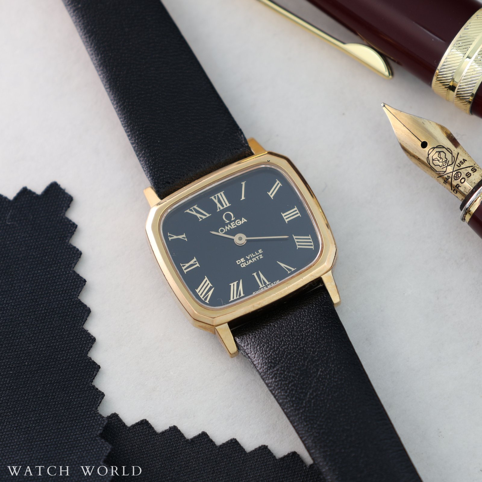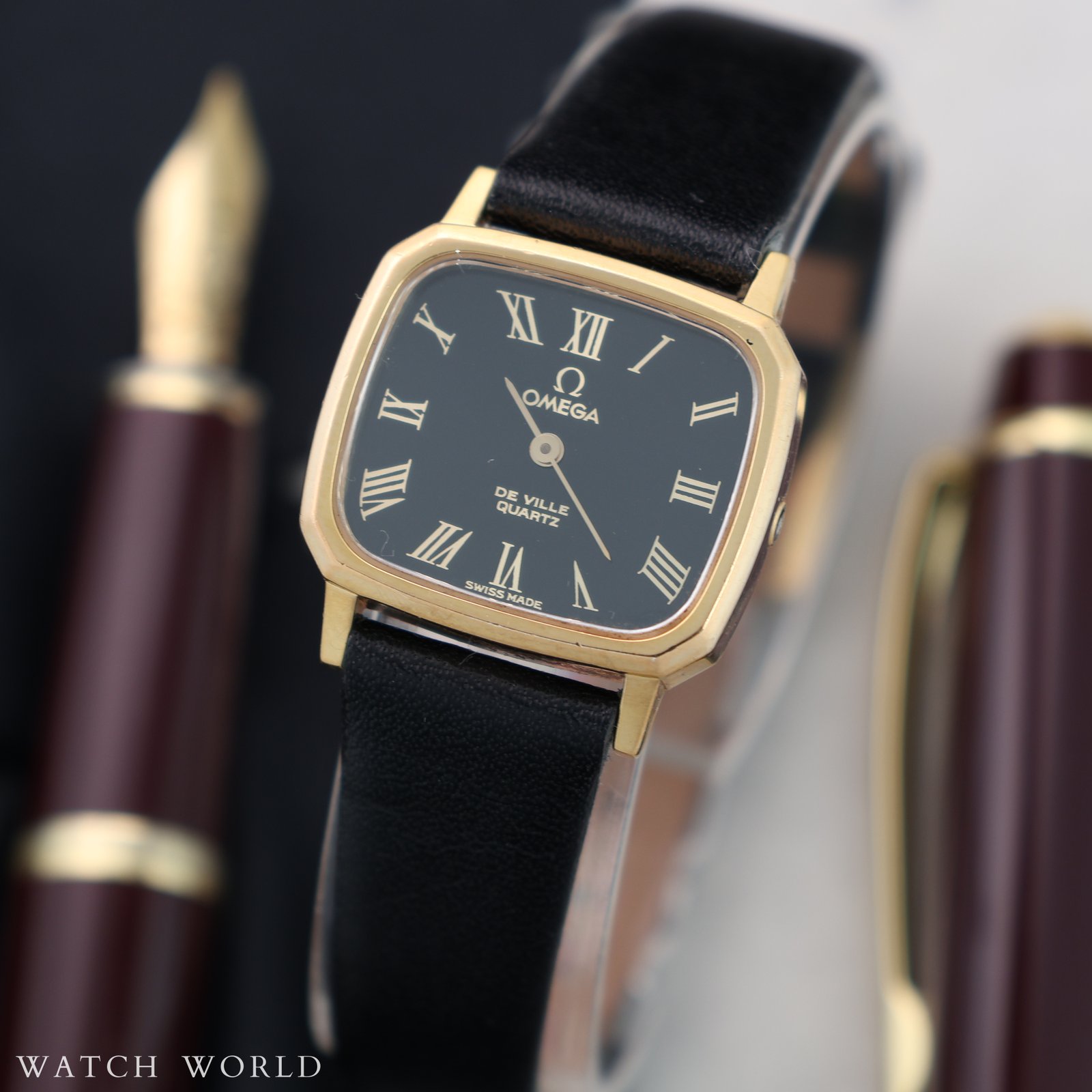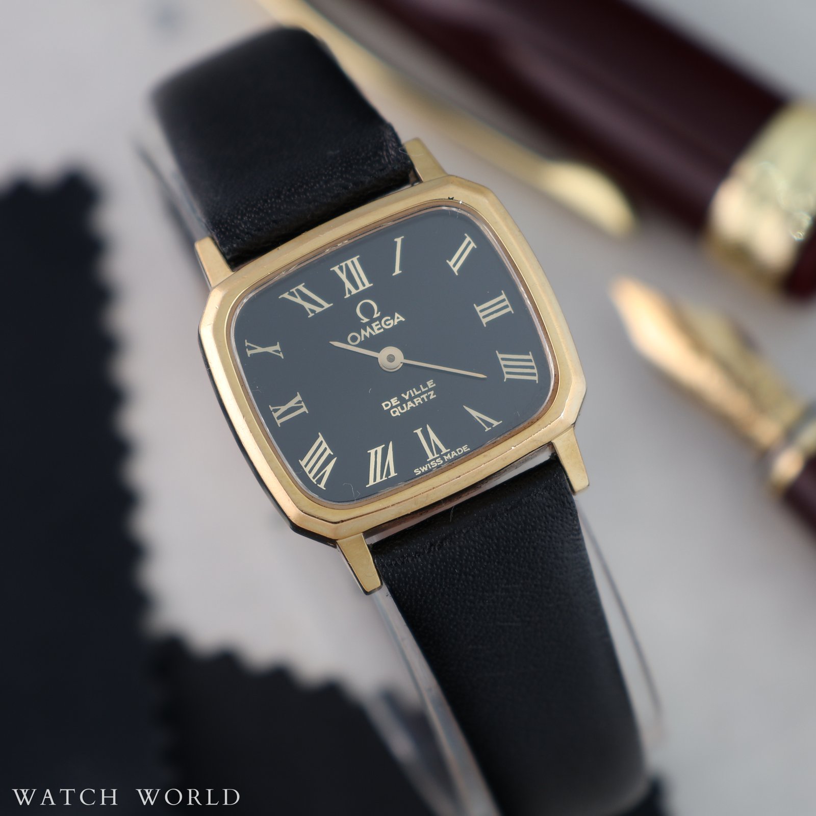 Omega Deville Lady black roman dial to wyjątkowy damski zegarek z połowy lat 80. Zachowany w pięknym stanie, zachwyca wyglądem czarnej tarczy ze szlifem słonecznym w połączeniu ze złotymi rzymskimi indeksami. Pozłacana koperta w rozmiarze 23 x 26mm razem z oryginalna logowana koronką i szkłem tworzą spójną, elegancką całość. W środku pracuje kwarcowy mechanizm Omega cal. 1353 zapewniający wysoką dokładność chodu i bezobsługowe użytkowanie. Całość oferowana jest razem z firmowym etui podróżnym oraz dodatkowo objęta jest 4 miesięczną gwarancją WatchWorld.