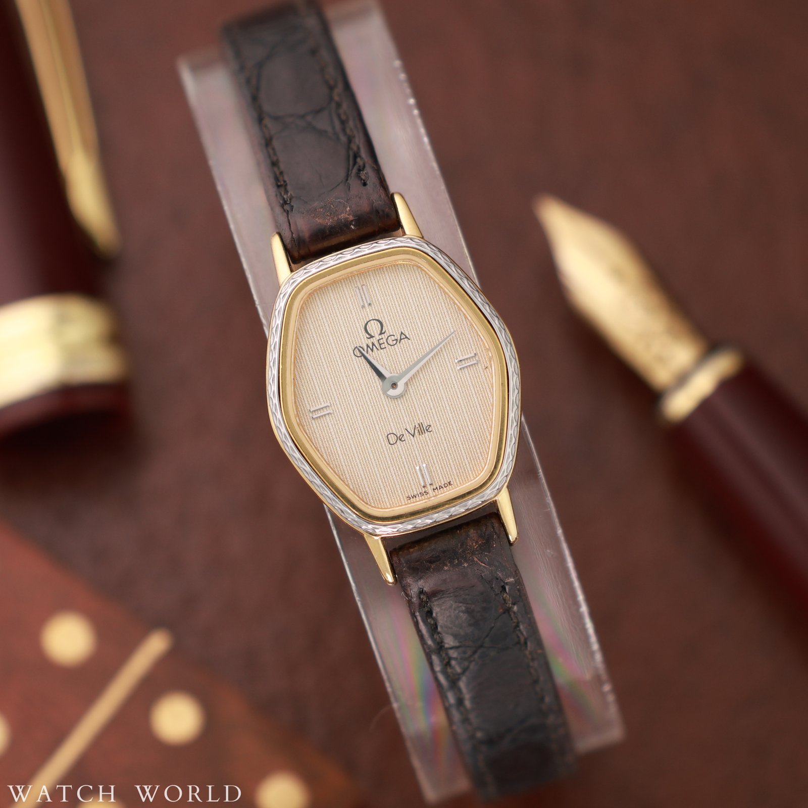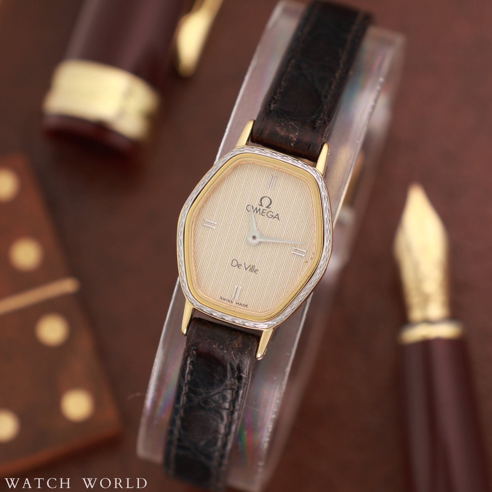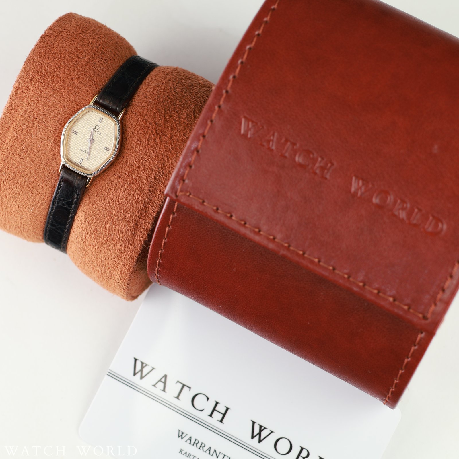 Omega Deville Lady Hexagon cal. 1387 to piękny damski zegarek z lat 80. Elegancki design koperty w rozmiarze 18x 26mm wyróżnia się pieczołowicie wykonanym bezelem który dodaje mu biżuteryjnego charakteru. Tarcza w kolorze szampańskim została wyposażona w wąskie wysokie indeksy oraz pasujące do całości wskazówki, które pięknie mienią się w świetle dziennym. Tarcza została ozdobiona pionowym wzorem w typie tapestry, który imponuje biorąc pod uwagę niewielkie rozmiary. Zegarek sprzedawany jest razem z oryginalnym paskiem w stanie dobrym choć wskazującym na wiek oraz oryginalną złoconą klamerką. W środku pracuje mechanizm kwarcowy Omega cal. 1387 na dobrym chodzie. Zegarek posiada oryginalne szkło oraz oryginalną ukrytą koronkę typu push. Całość oferowana jest z firmowym etui podróżnym WatchWorld oraz objęta 4 miesięczną gwarancją.