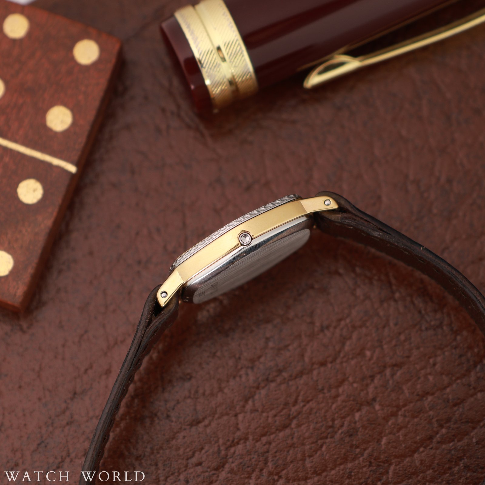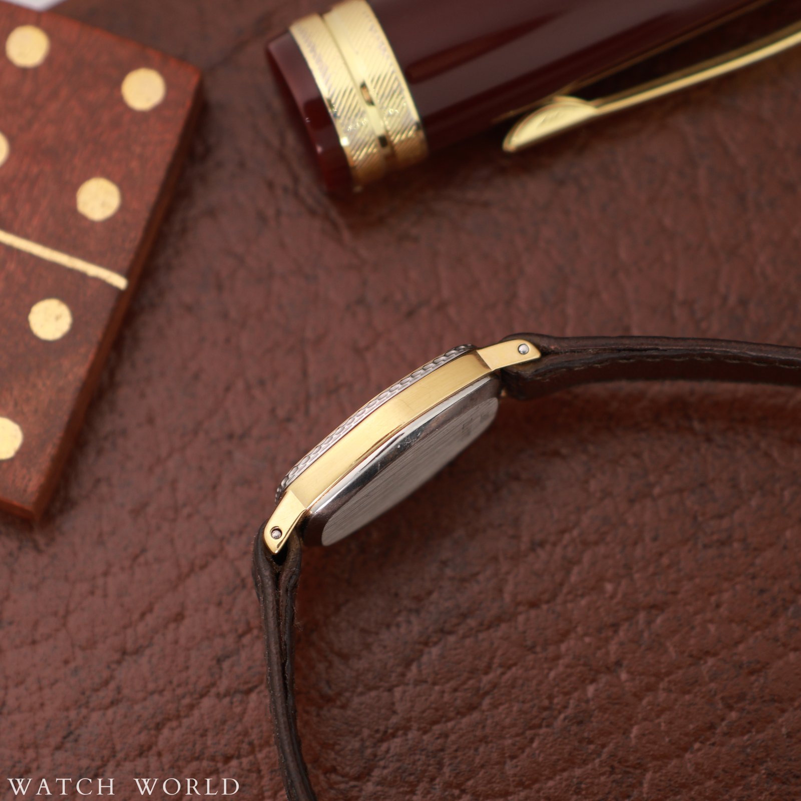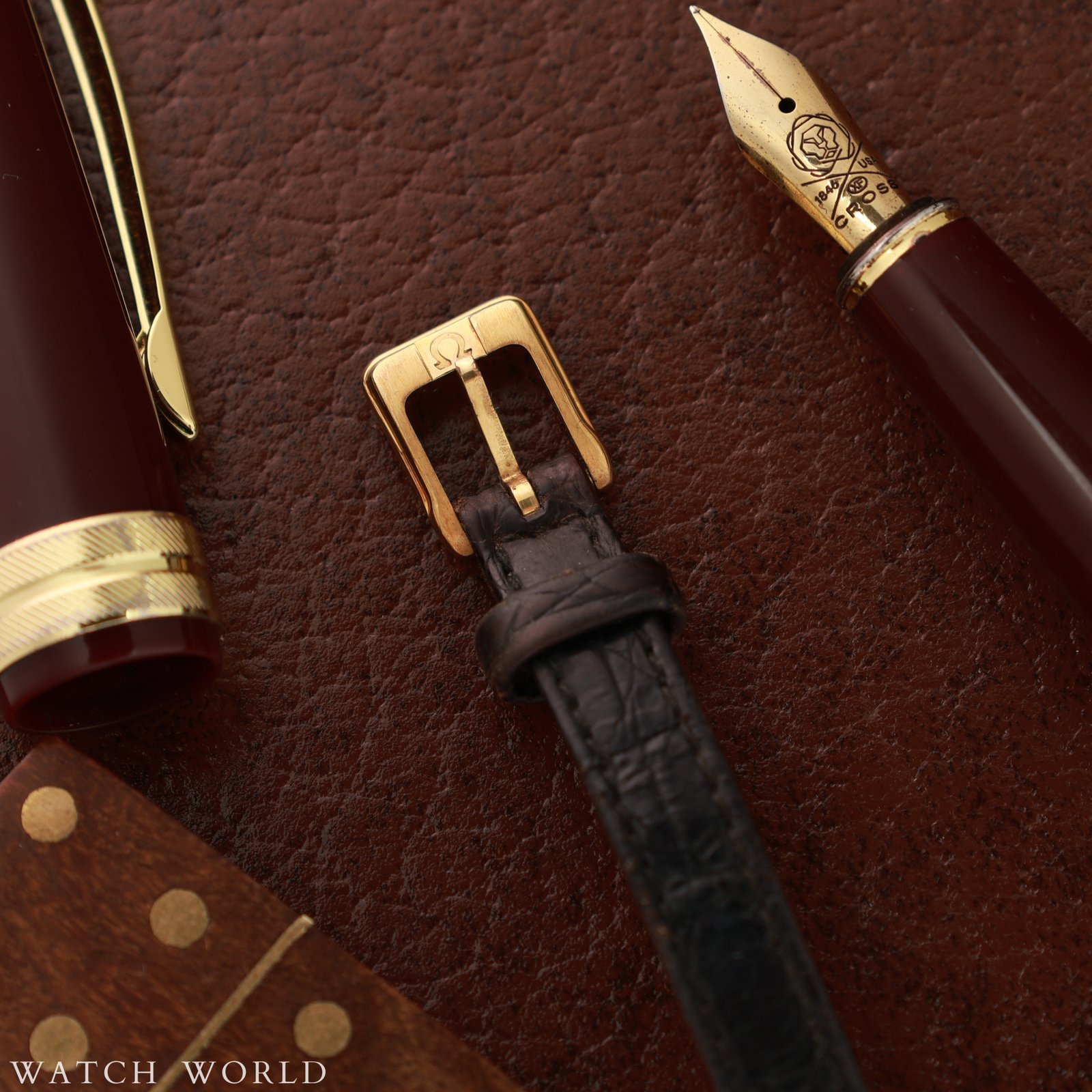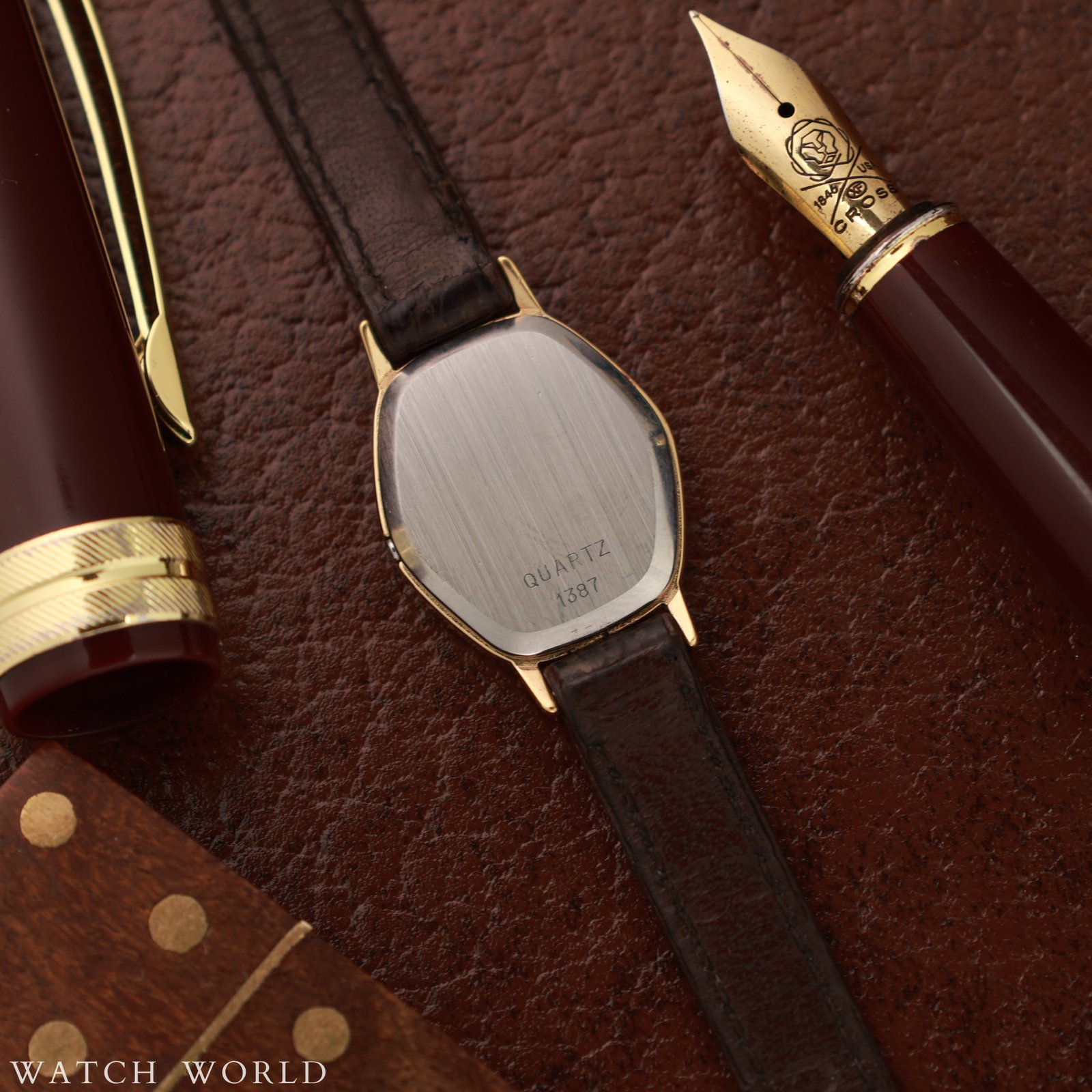 Omega Deville Lady Hexagon cal. 1387 to piękny damski zegarek z lat 80. Elegancki design koperty w rozmiarze 18x 26mm wyróżnia się pieczołowicie wykonanym bezelem który dodaje mu biżuteryjnego charakteru. Tarcza w kolorze szampańskim została wyposażona w wąskie wysokie indeksy oraz pasujące do całości wskazówki, które pięknie mienią się w świetle dziennym. Tarcza została ozdobiona pionowym wzorem w typie tapestry, który imponuje biorąc pod uwagę niewielkie rozmiary. Zegarek sprzedawany jest razem z oryginalnym paskiem w stanie dobrym choć wskazującym na wiek oraz oryginalną złoconą klamerką. W środku pracuje mechanizm kwarcowy Omega cal. 1387 na dobrym chodzie. Zegarek posiada oryginalne szkło oraz oryginalną ukrytą koronkę typu push. Całość oferowana jest z firmowym etui podróżnym WatchWorld oraz objęta 4 miesięczną gwarancją.