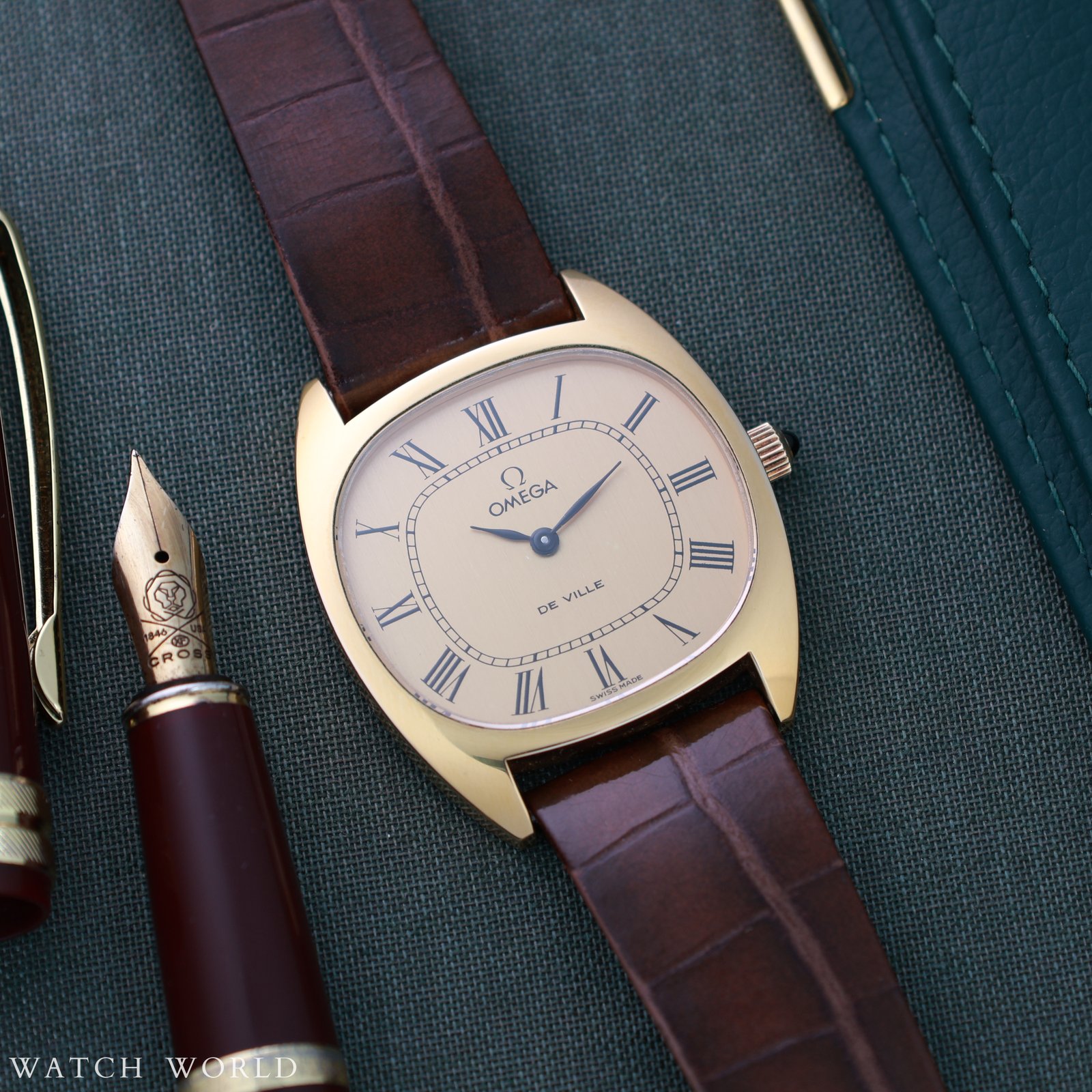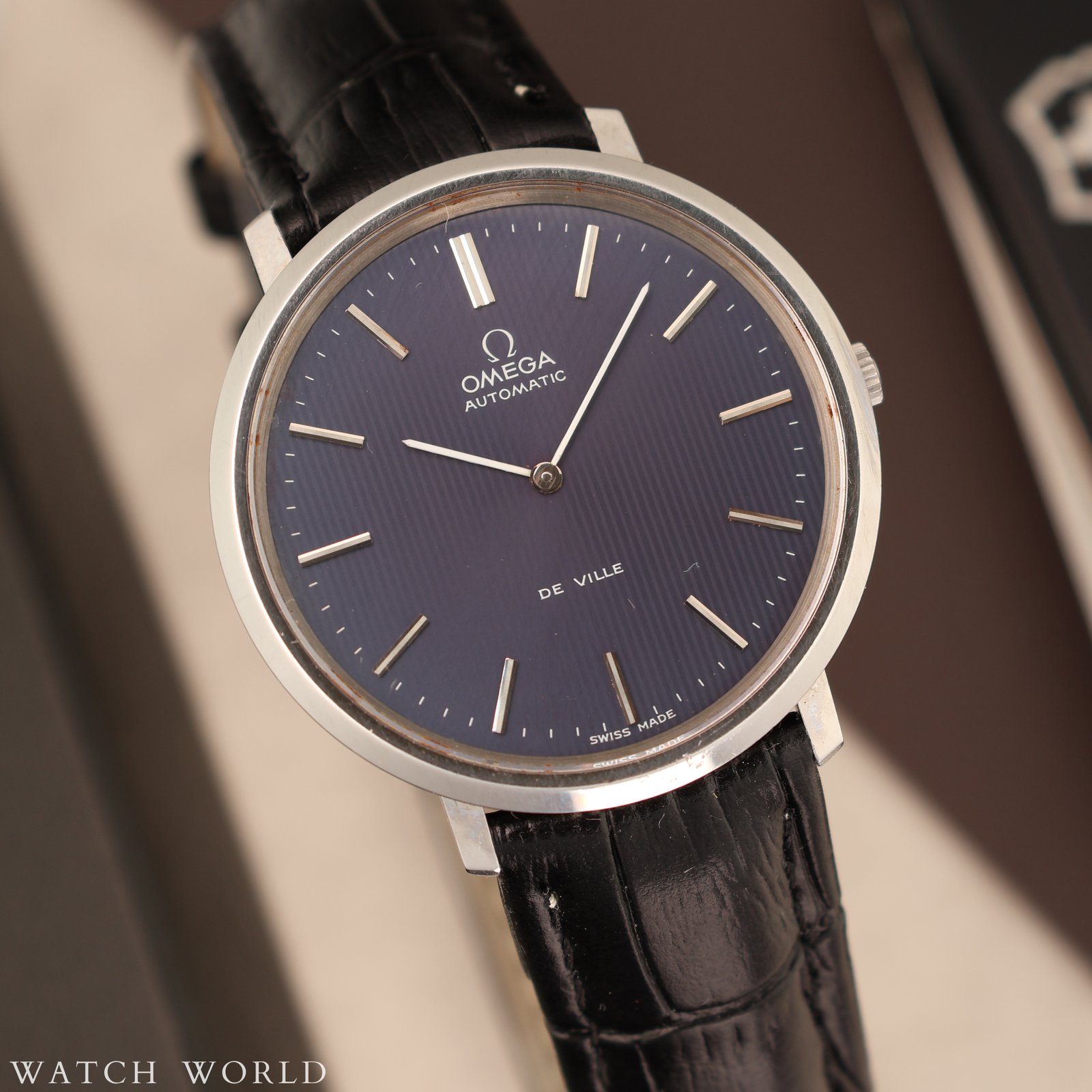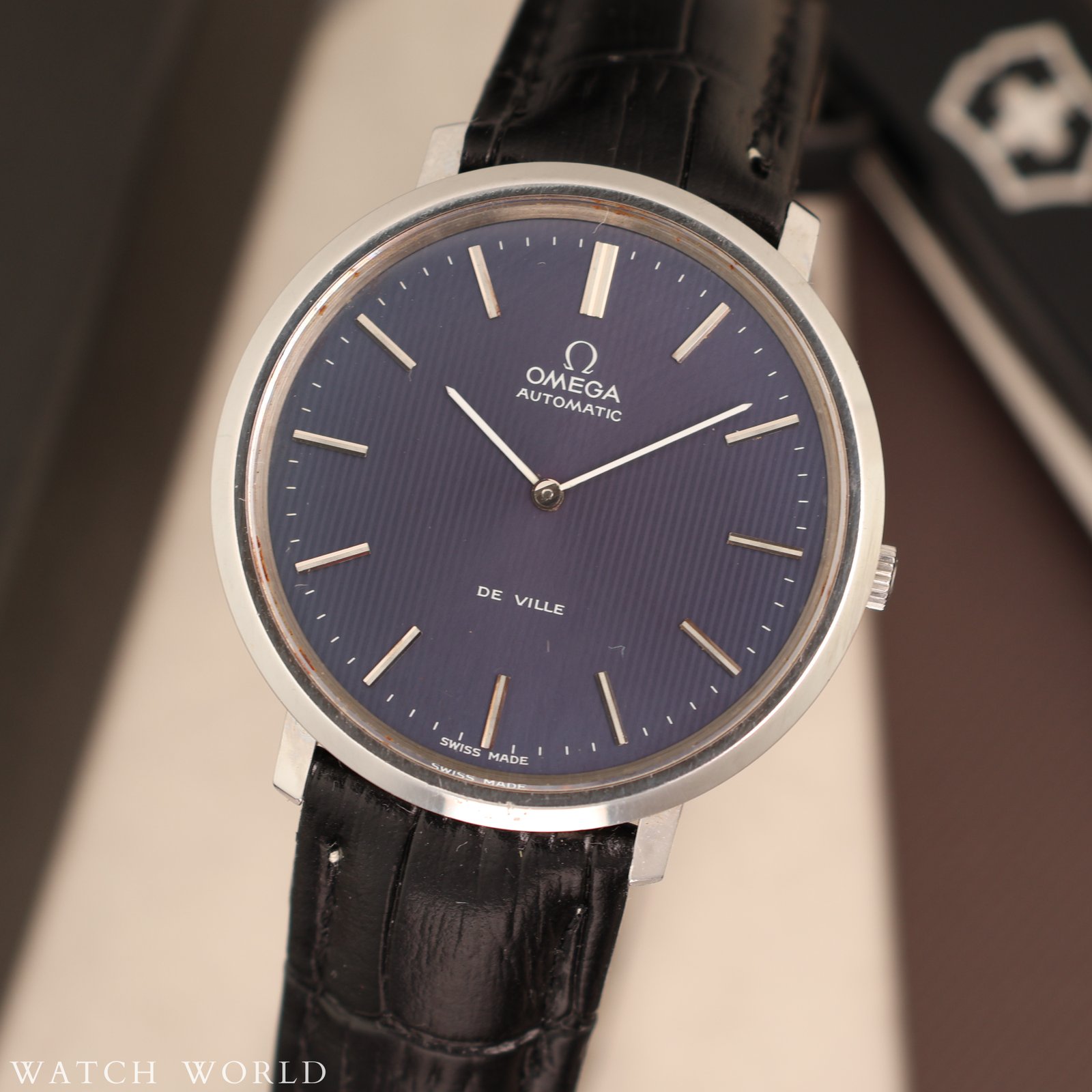 Omega Deville Tapestry Dial 151.0039 cal. 711 to elegancki zegarek vintage z początku lat 70, który wyróżnia się ultra cienką konstrukcją koperty. Zegarek ma wymiary 36 × 38 mm i wykonany jest ze stali nierdzewnej, z klasycznym profilem typowym dla linii DeVille. Najbardziej wyróżniającym się elementem tego modelu jest tarcza typu „tapestry” — ozdobiona pionowym giloszowaniem w kolorze ciemno niebieskim, ten wariant jest zdecydowanie rzadziej spotykany niz pozostałe wersje tej referencji. Wewnątrz zegarka pracuje automatyczny mechanizm cal. 711 słynący z niezawodności i niezwykłej smukłości idealnej do eleganckich, klasycznych zegarków. Mechanizm na dobrym chodzie, objęty 4 miesięczną gwarancją. Zegarek sprzedawany jest na nowym skórzanym pasku, z nieoryginalną klamerką. Zegarek dostarczany jest z firmowym etui podróżnym WatchWorld.