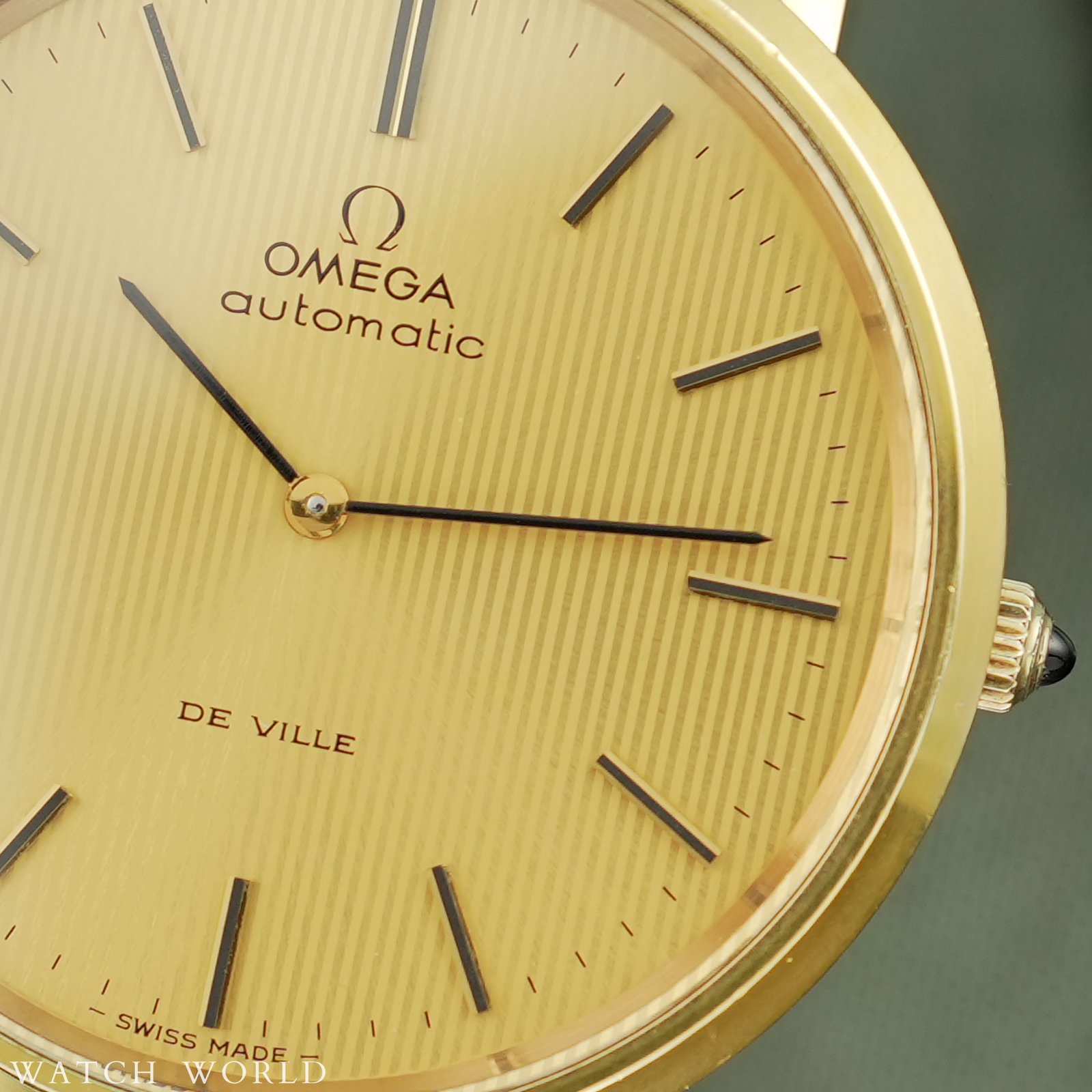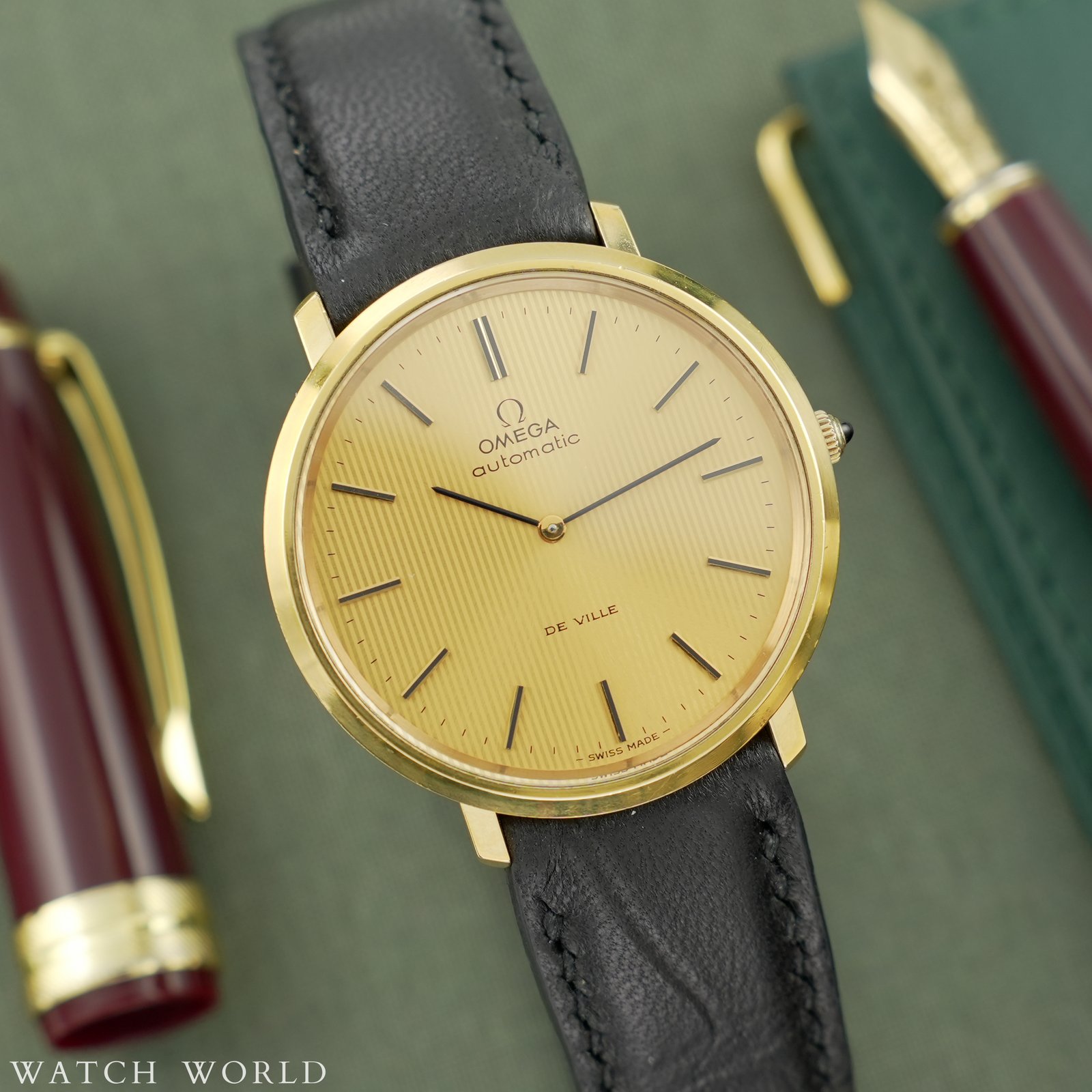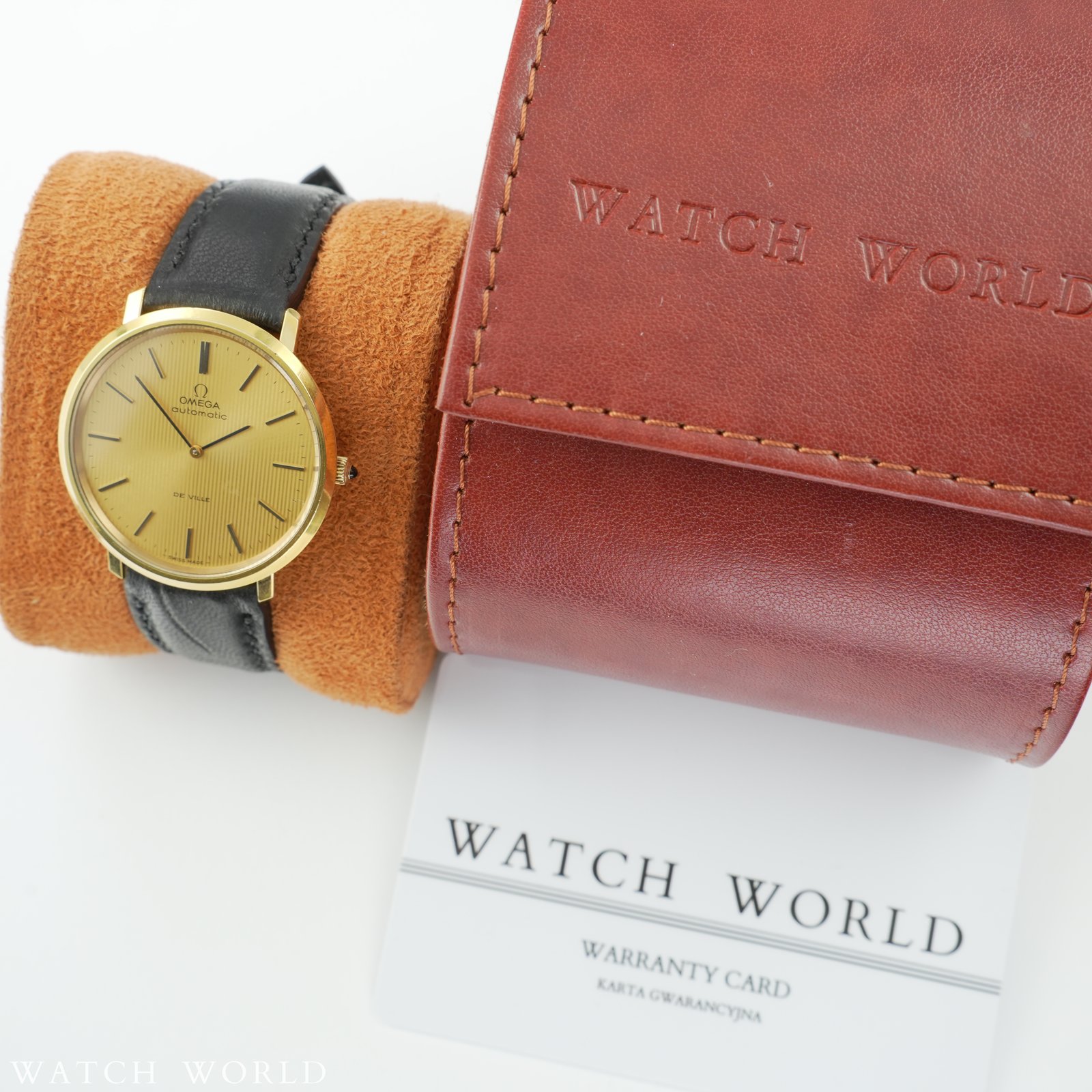 Omega Deville Tapestry Dial 151.0039 cal. 711 to elegancki zegarek vintage z początku lat 70, który wyróżnia się ultra cienką konstrukcją koperty. Zegarek ma wymiary 36 × 38 mm i wykonany jest z pozłacanej stali nierdzewnej, z delikatnie zaokrąglonymi krawędziami i klasycznym profilem typowym dla linii DeVille. Najbardziej wyróżniającym się elementem tego modelu jest tarcza typu „tapestry” — ozdobiona pionowym giloszowaniem przypominającym teksturę tkaniny w odcieniu złotym. Wewnątrz zegarka pracuje automatyczny mechanizm cal. 711 słynący z niezawodności i niezwykłej smukłości idealnej do eleganckich, klasycznych zegarków. Mechanizm świezo po pełnym serwisie zegarmistrzowskim, objęty 12 miesięczną gwarancją. Zegarek sprzedawany razem z nowym, ręcznie robionym skórzanym paskiem. Zegarek ostarczany jest z firmowym etui podróżnym WatchWorld.