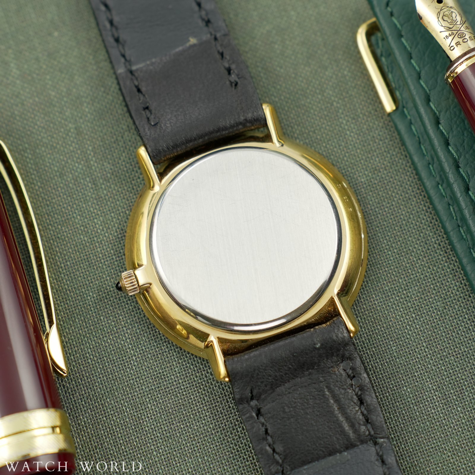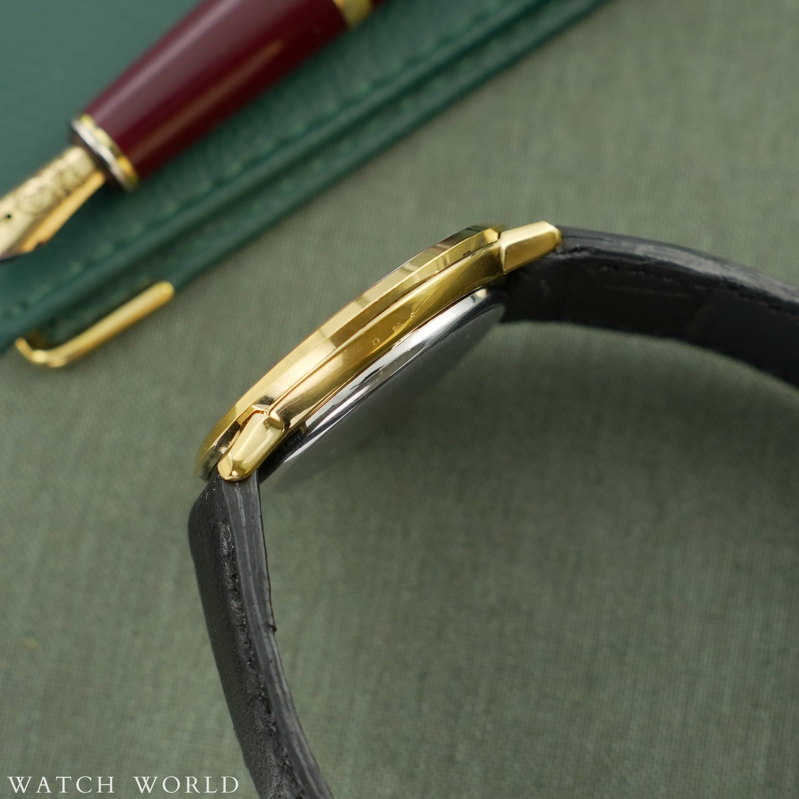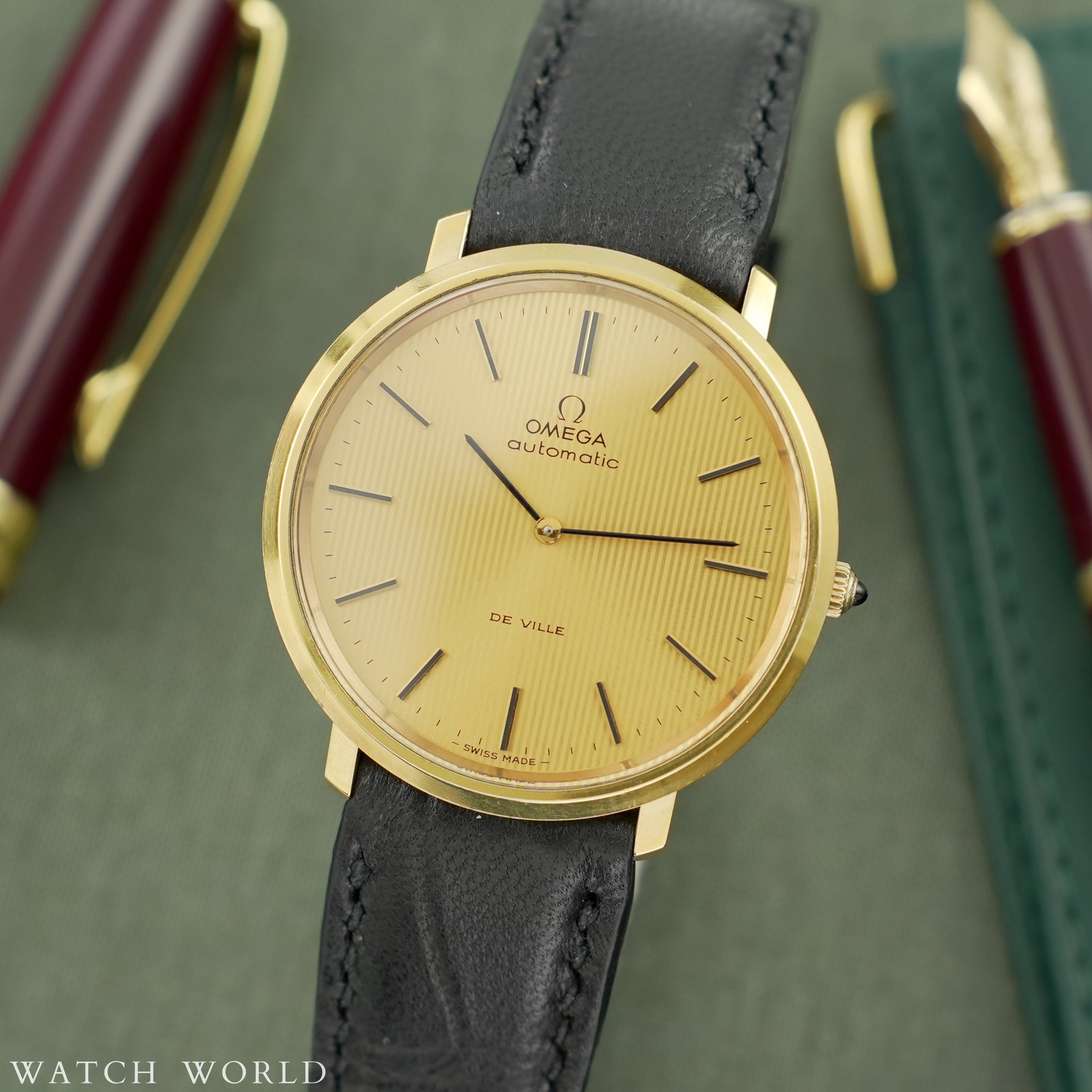 Omega Deville Tapestry Dial 151.0039 cal. 711 to elegancki zegarek vintage z początku lat 70, który wyróżnia się ultra cienką konstrukcją koperty. Zegarek ma wymiary 36 × 38 mm i wykonany jest z pozłacanej stali nierdzewnej, z delikatnie zaokrąglonymi krawędziami i klasycznym profilem typowym dla linii DeVille. Najbardziej wyróżniającym się elementem tego modelu jest tarcza typu „tapestry” — ozdobiona pionowym giloszowaniem przypominającym teksturę tkaniny w odcieniu złotym. Wewnątrz zegarka pracuje automatyczny mechanizm cal. 711 słynący z niezawodności i niezwykłej smukłości idealnej do eleganckich, klasycznych zegarków. Mechanizm świezo po pełnym serwisie zegarmistrzowskim, objęty 12 miesięczną gwarancją. Zegarek sprzedawany razem z nowym, ręcznie robionym skórzanym paskiem. Zegarek ostarczany jest z firmowym etui podróżnym WatchWorld.