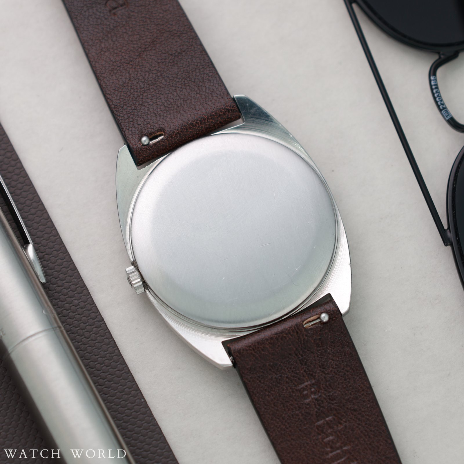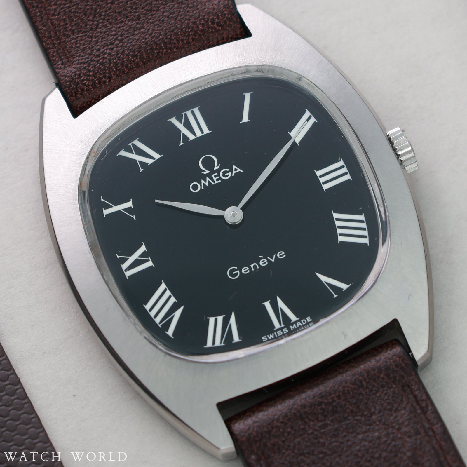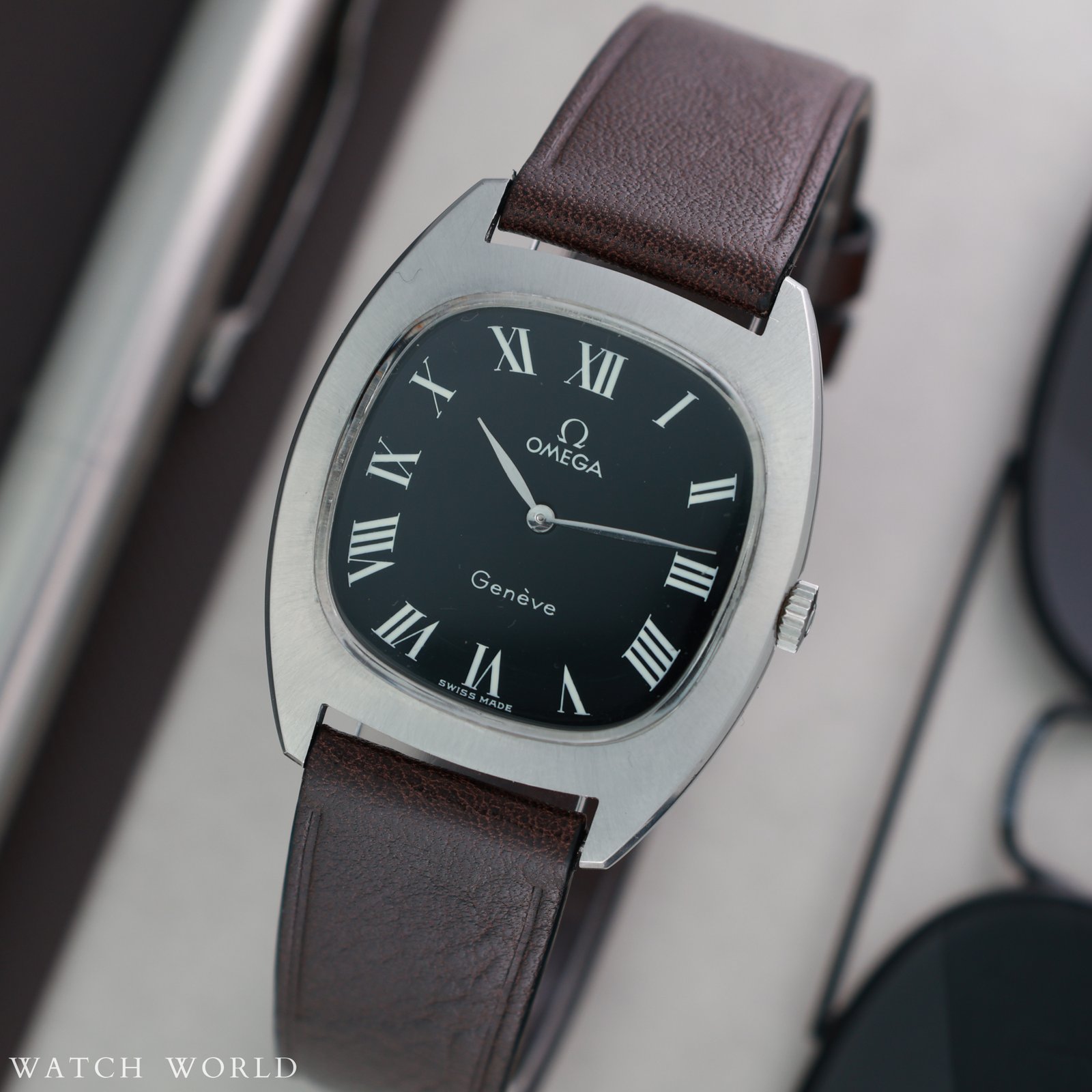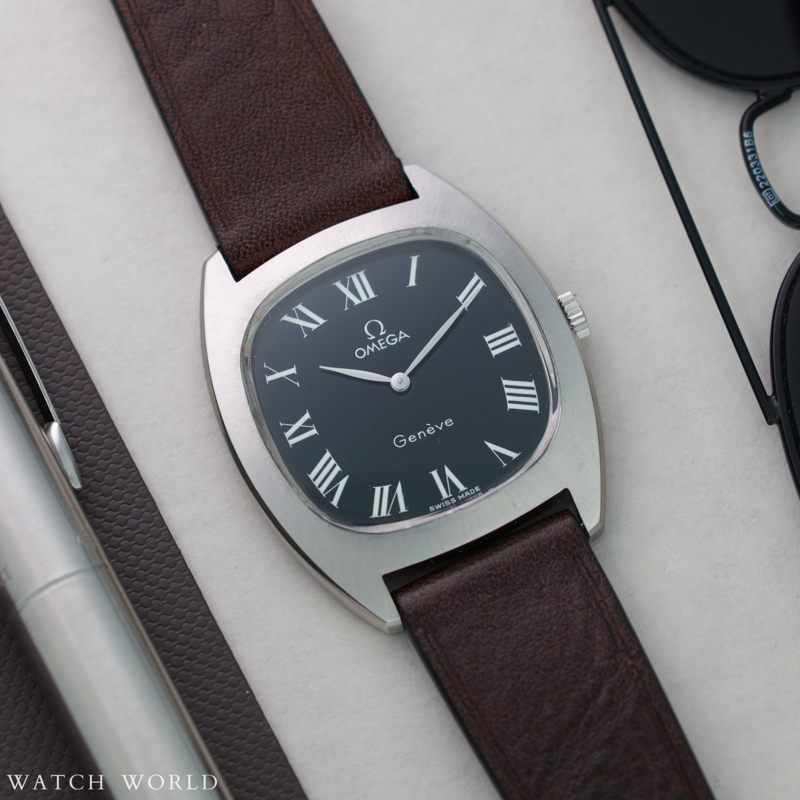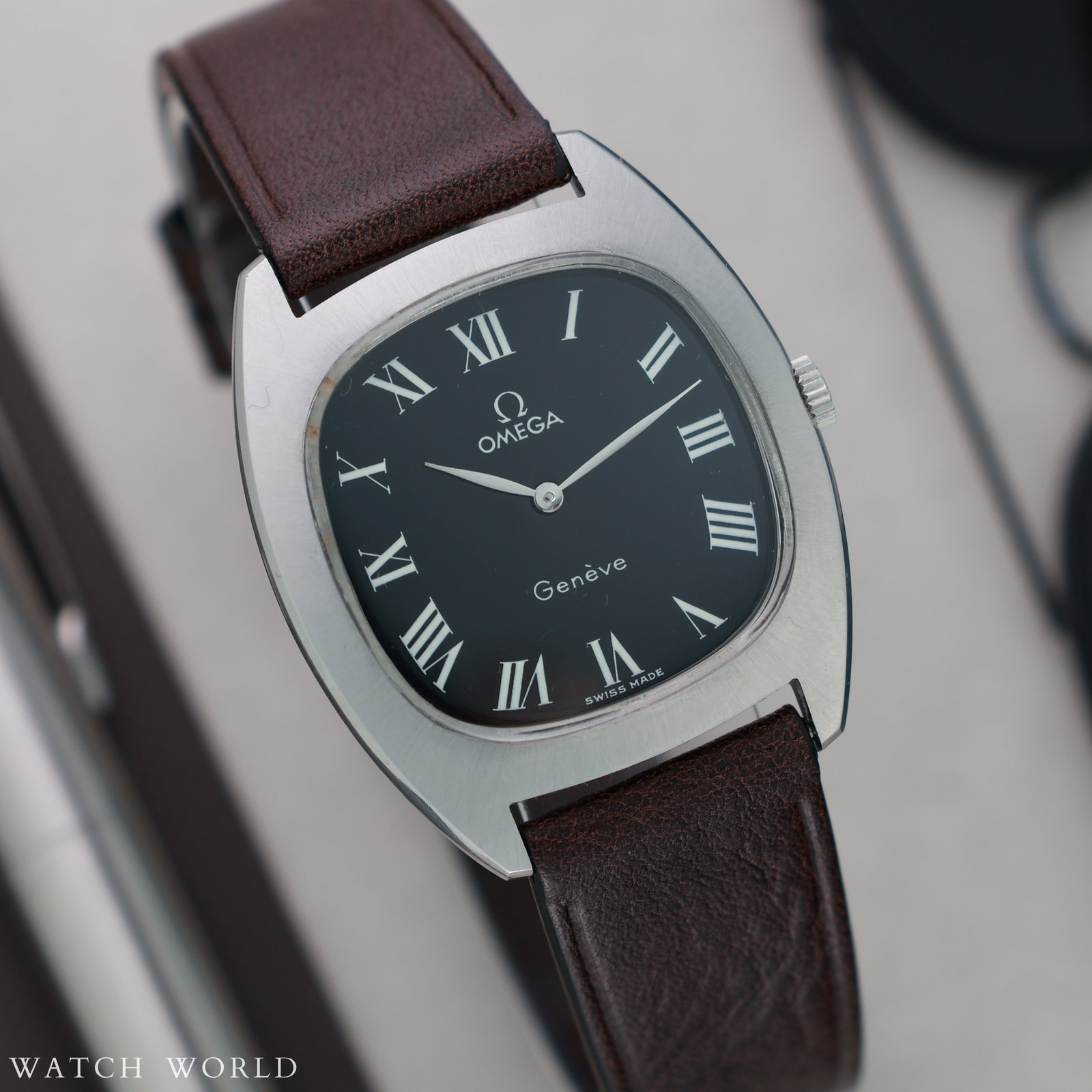 Omega Geneve 866101 Black Roman dial to wyjątkowy egzemplarz z lat 70 w rzadkiej konfiguracji z czarną tarczą i białymi rzymskimi indeksami zamkniętymi w kopercie typu tonneau. Stalowa koperta w rozmiarze 33mm doskonale wkomponowuje się nadgarstek dodając unikalnej elegancji. W środku zegarka pracuje niezawodny manualny mechanizm cal. 625 słynący z precyzji i długowieczności. Całość dopełnia logowana koronka oraz logowane, oryginalne szkło. Zegarek sprzedawany jest na nowym skórzanym pasku wysokiej jakości. Mechanizm świeżo po pełnym serwisie zegarmistrzowskim, objęty 12 miesięczną gwarancją. Zestaw stanowi zegarek oraz nowe firmowe etui podróżne WatchWorld.