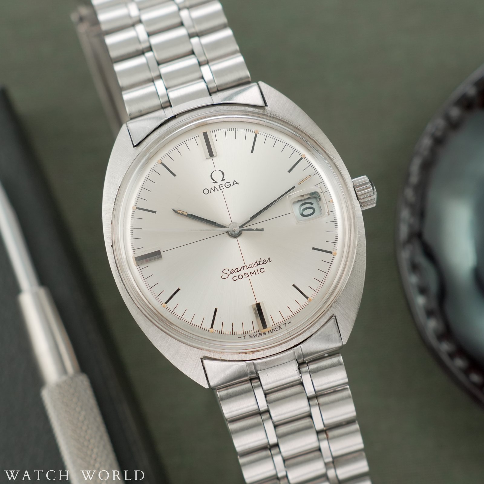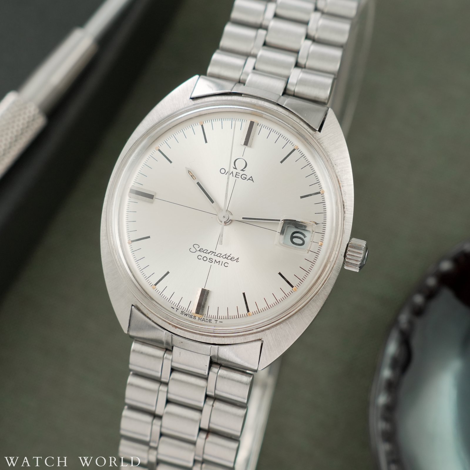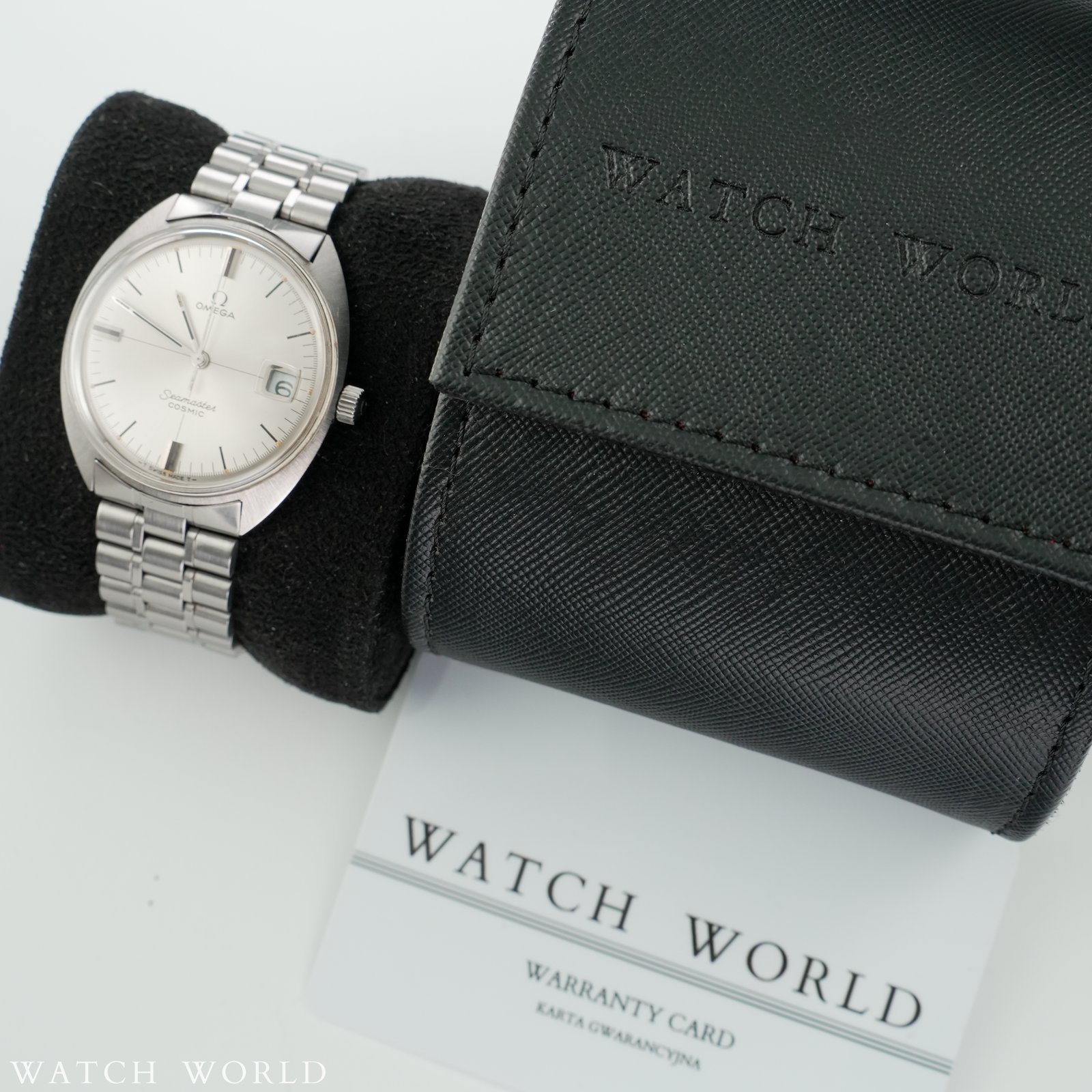 Omega Seamaster Cosmic ref. 136.017 cal. 611 to sportowy, automatyczny Seamsater z lat 70, o charakterystycznym, unikalnym designie. Stalowa koperta w rozmiarze 35mm bez koronki przykuwa uwagę świetnym stanem zachowania oraz nieszablonowym kształtem tzw. c-shape, jeden ze znaków rozpoznawalnych designu lat 70. W środku pracuje niezawodny i szeroko uznany mechanizm automatyczny Omega cal. 565 z funkcją szybkiej zmiany daty. Tarcza srebrna w świetnym stanie zachowania, pełen oryginal, logowana koronka oraz szkło. Zegarek oferowany jest z oryginalną bransoletą dedykowaną dla tego modelu, co podkreśla i do końca definiuje jego sportowy charakter. Zegarek objęty jest 4 miesięczną gwarancją i dostarczony jest w firmowym etui podróżnym WatchWorld.