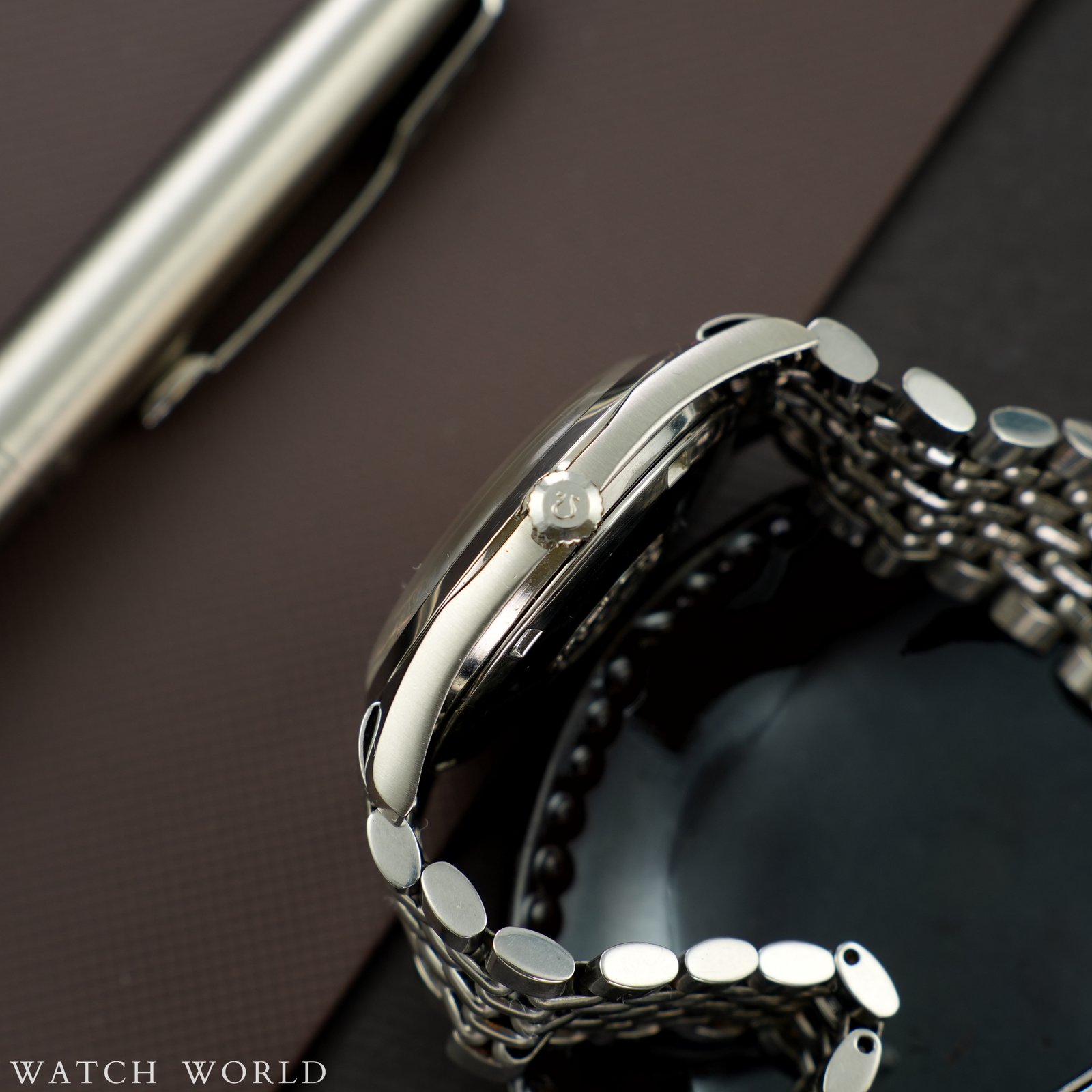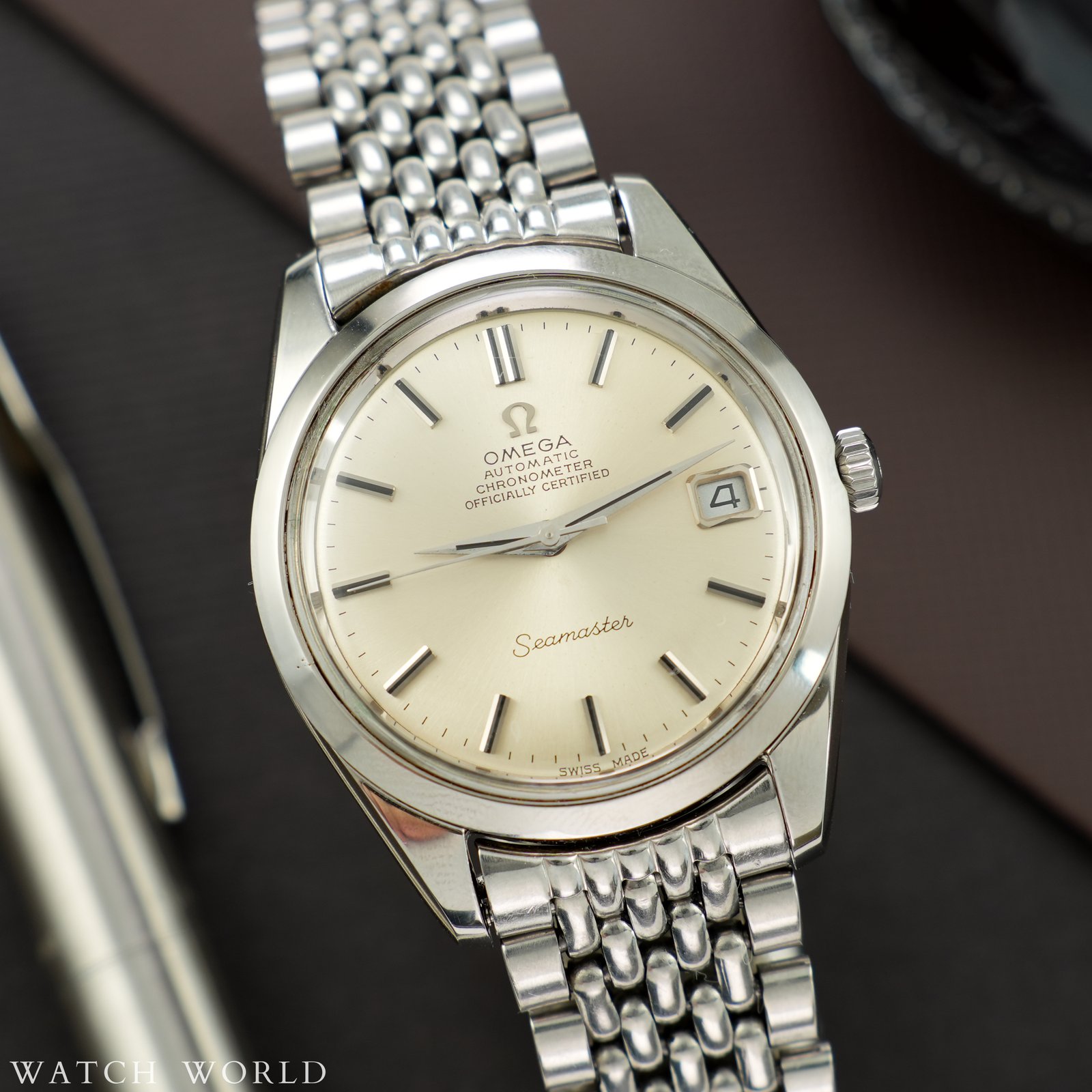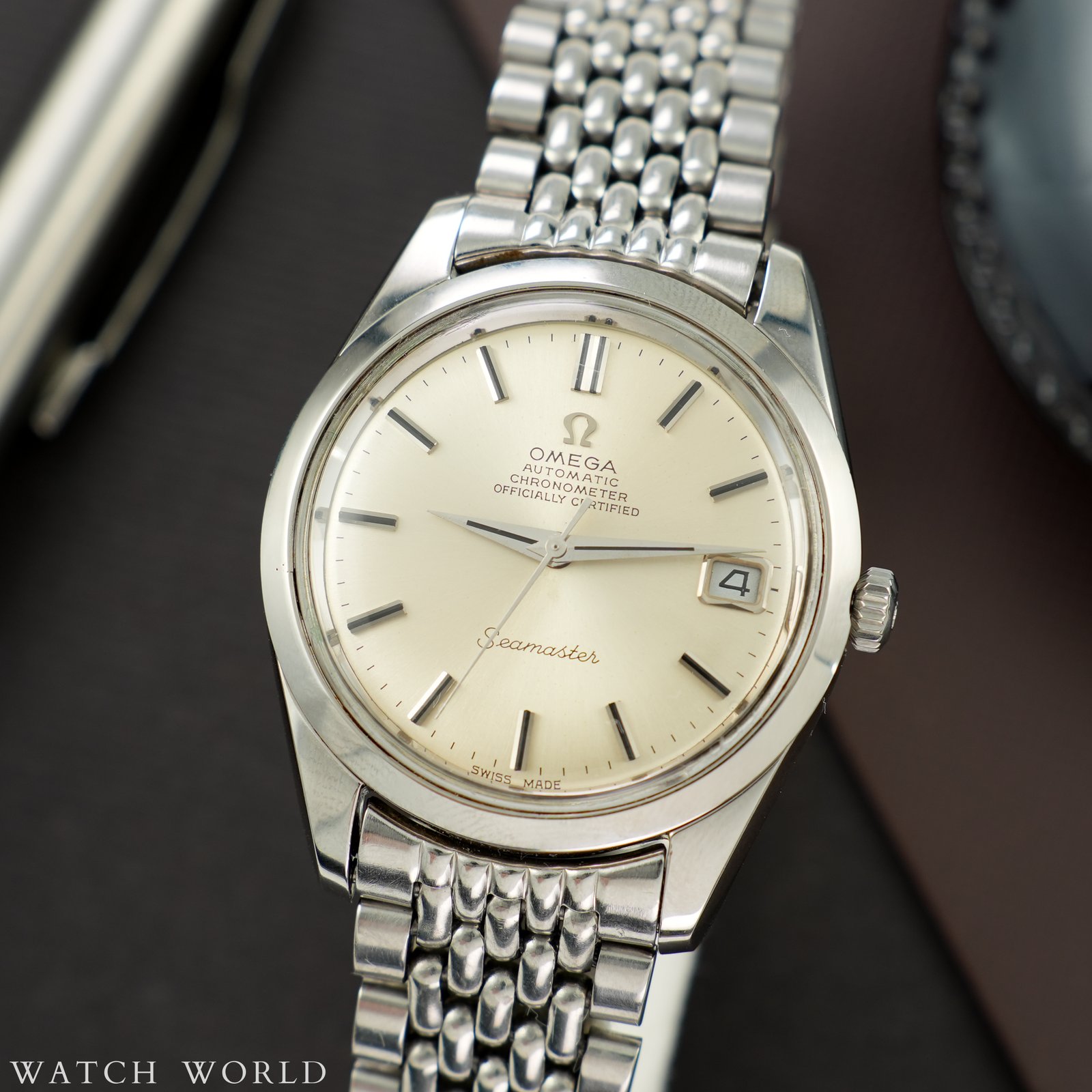 Omega Seamaster ref. 168.024 cal. 564 to sportowy, automatyczny Seamsater z przełomu lat 60 i 70, uchodzący za jedną z najbardziej poważanych referencji z tamtego okresu. Stalowa koperta w rozmiarze 35mm bez koronki połączona razem z jedną z najlepszych bransolet Omegi tzw. beads of rice (BOR) tworzy wyjątkowy, sportowo elegancki wydźwięk zegarka. W środku pracuje niezawodny i szeroko uznany mechanizm automatyczny Omega cal. 564 z funkcją szybkiej zmiany daty, w wariancie certyfikowanego chronometru. Mechanizm po serwisie zegarmistrzowskim. Tarcza srebrna zachowana w świetnym jak na wiek stanie, praktycznie bez śladów starzenia. Razem ze wskazówkami typu dauphine i podłużnymi wysokimi indeksami tworzy spójną, wizualnie czystą formę. Stalowa bransoleta ma długość około 19 cm, zachowana w dobrym stanie, jedynie z powierzchniowymi rysami na zapięciu. Zegarek objęty jest 12 miesięczną gwarancją i dostarczony jest w firmowym etui podróżnym WatchWorld.