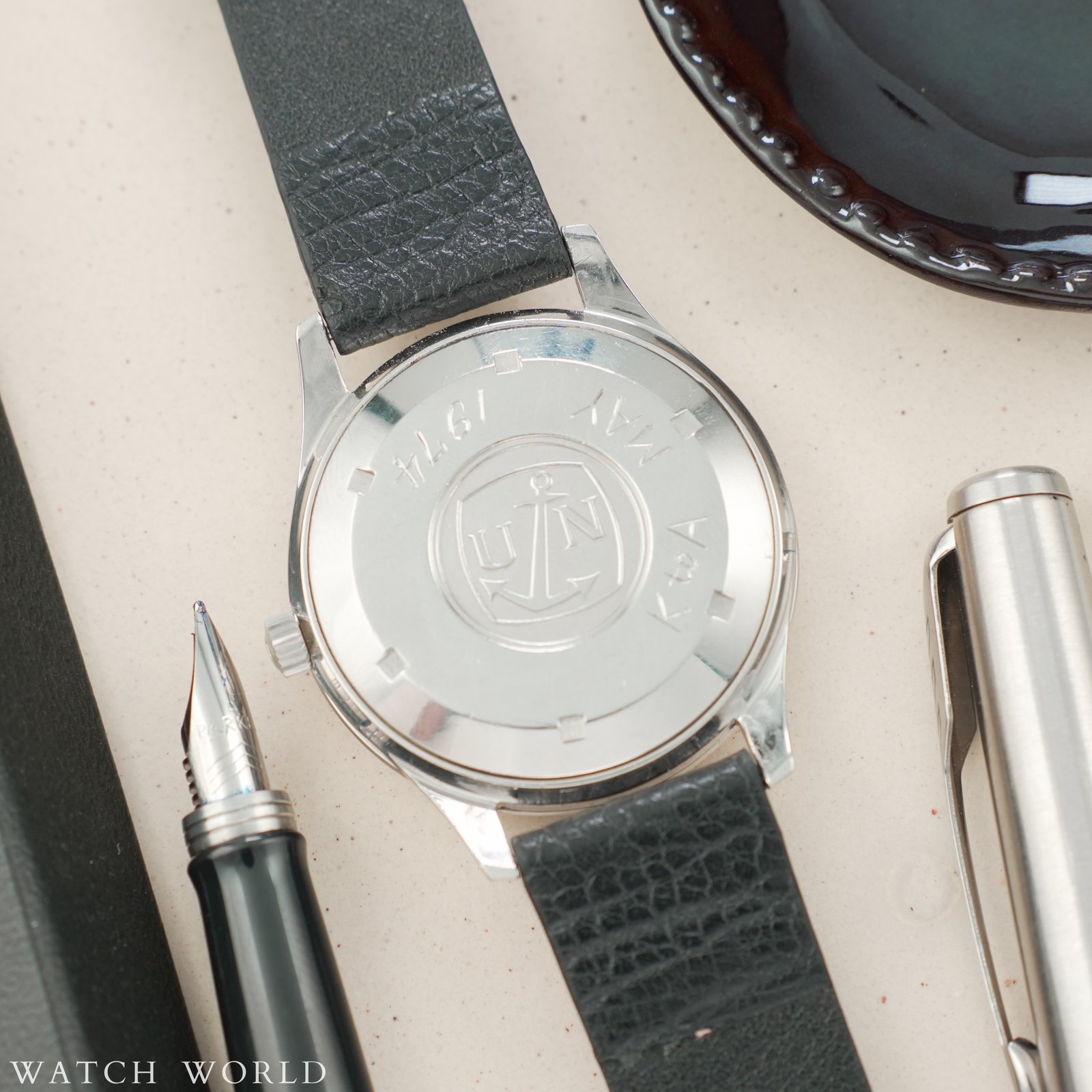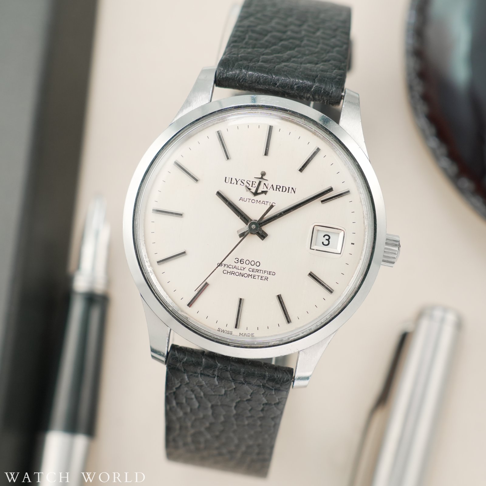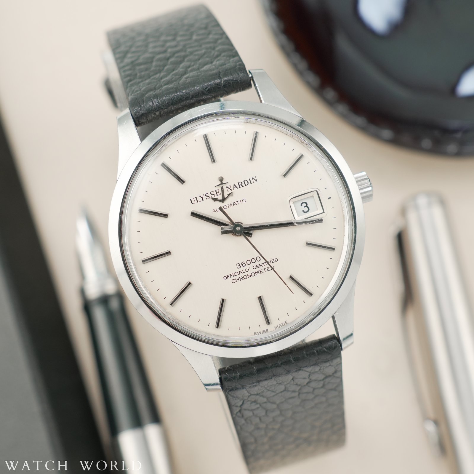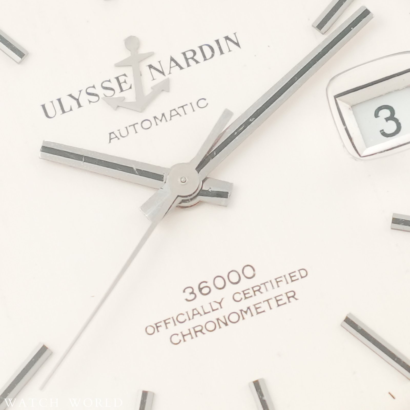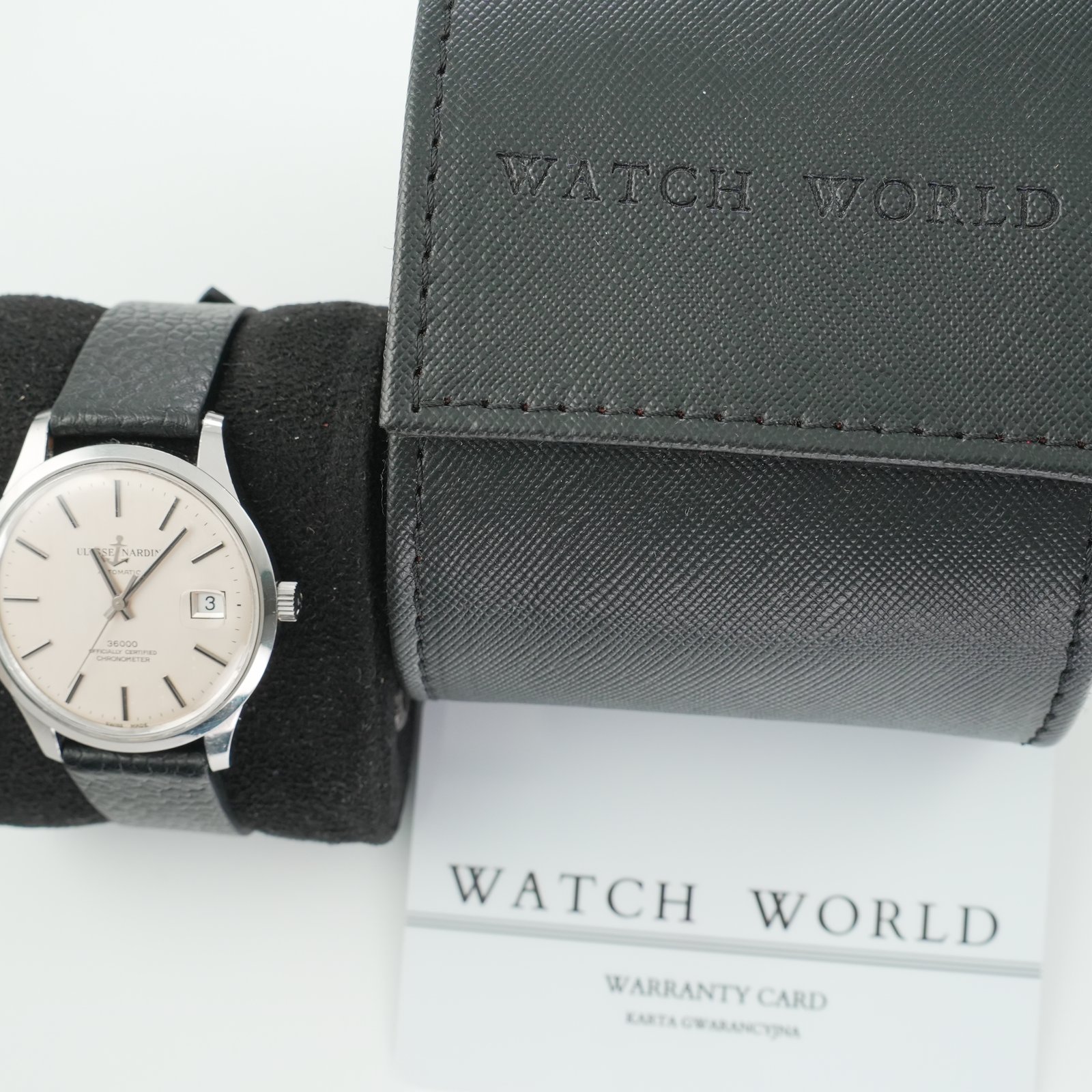 Ulysse Nardin 36000 cal. NB 11 QU to rzadki kolekcjonerski zegarek uznanego szwajcarskiego producenta Ulysse Nardin. Charakteryzuje się on kopertą jumbo w nowoczesnym rozmiarze 36.5mm z tarczą, zachowaną w pełni oryginalnym, dobrym stanie. Charakterystyczne nakładane logo kotwicy dodaje prestiżu. Kotwicę można zobaczyć również w formie grawerunku na deklu oraz na koronce jako symbol marki i jej powiązania z zegarami morskimi. W środku pracuje automatyczny mechanizm Ulysse Nardin NB11QU słynący z niezawodności i solidności konstrukcji, wyróżnia się wysoką czestotliwością pracy – 36000bph, czyli tzw. płynąca sekunda. Mechanizm świeżo po pełnym serwisie zegarmistrzowskim. Całość oferowana jest z nowym, skórzanym, ręcznie robionym paskiem ze skóry strusia. Zegarek objęty jest 12 miesięczną gwarancją oraz dostarczany z firmowym etui podróżnym WatchWorld.