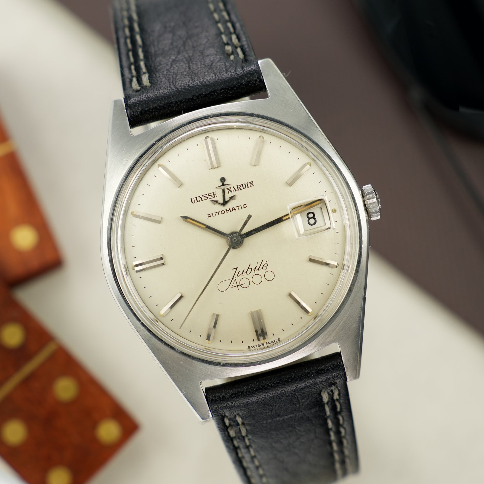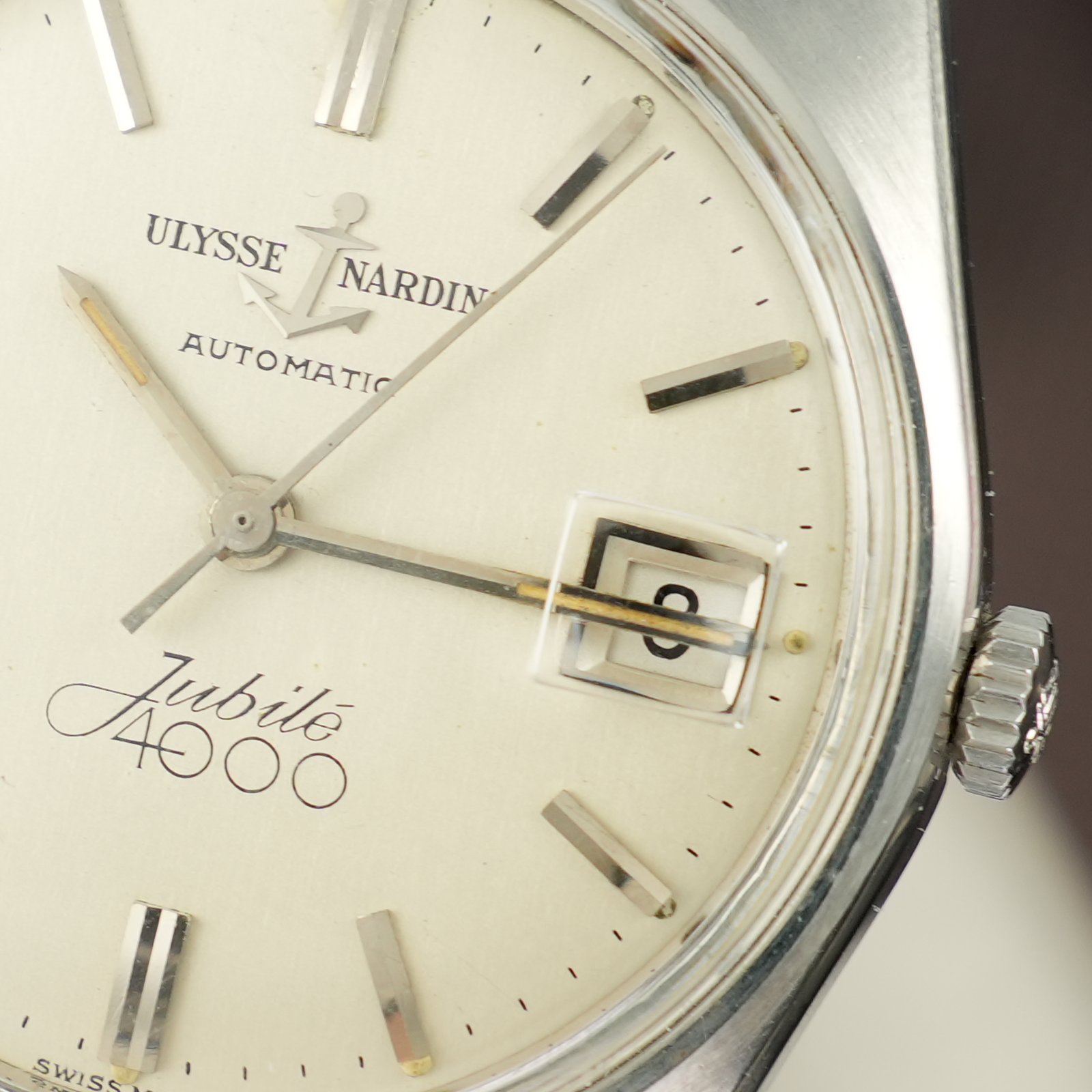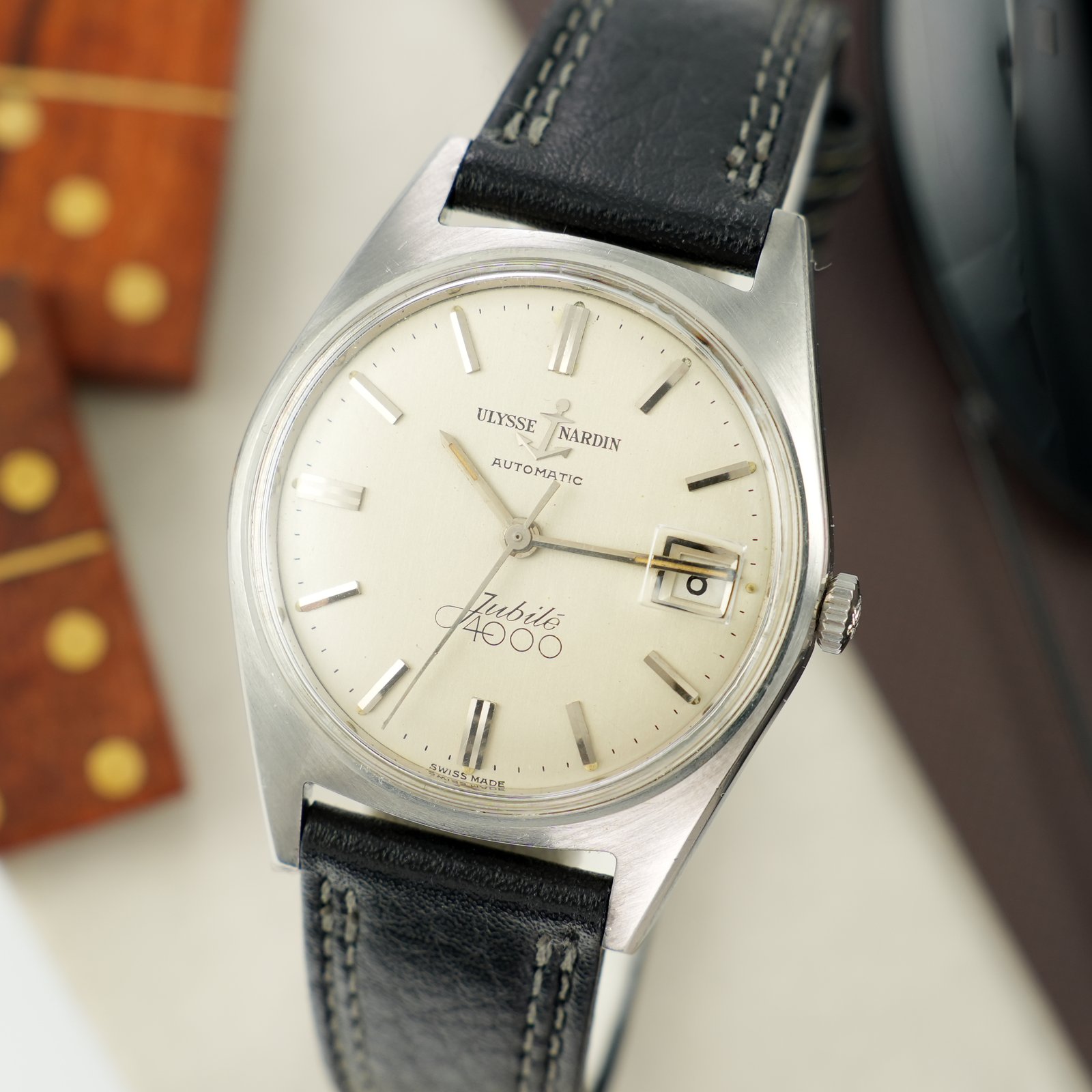 Ulysse Nardin Jubilee 4000 cal. N74 to rzadki kolekcjonerski zegarek uznanego szwajcarskiego producenta Ulysse Nardin. Charakteryzuje się on stalową kopertą w rozmiarze 34.5mm jednak poprzez masywny typ kopery, większe uszy nosi się jako większy. Charakterystyczne nakładane logo kotwicy dodaje prestiżu. Kotwicę można zobaczyć również w formie grawerunku na deklu oraz na koronce jako symbol marki i jej powiązania z zegarami morskimi. Zegarek zachowany jest w bardzo dobrym stanie jak na wiek, tarcza praktycznie bez śladów starzenia. W środku pracuje automatyczny mechanizm Ulysse Nardin N74 słynący z niezawodności i solidności konstrukcji, na dobrym chodzie. Całość oferowana jest z ręcznie wykonanym, skórzanym paskiem w dobrym stanie. Zegarek objęty jest 4 miesięczną gwarancją oraz dostarczany z firmowym etui podróżnym WatchWorld.