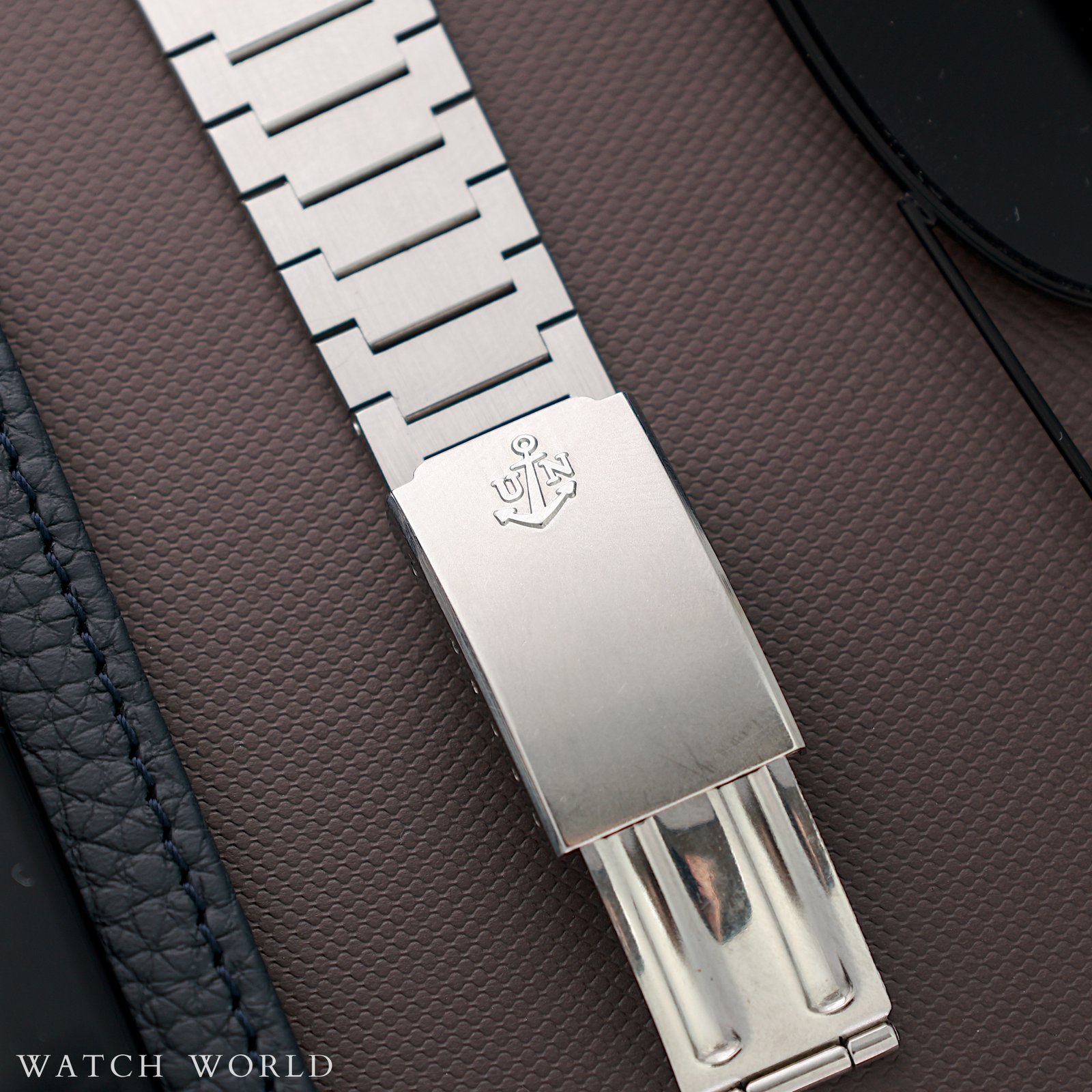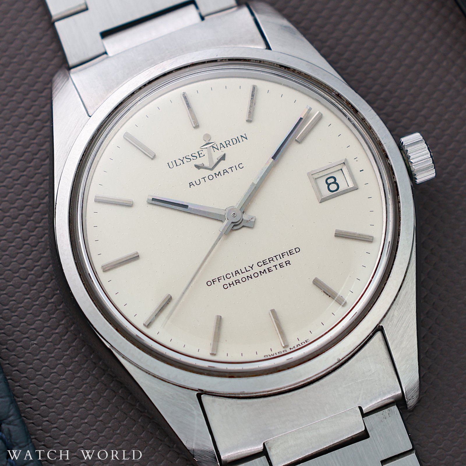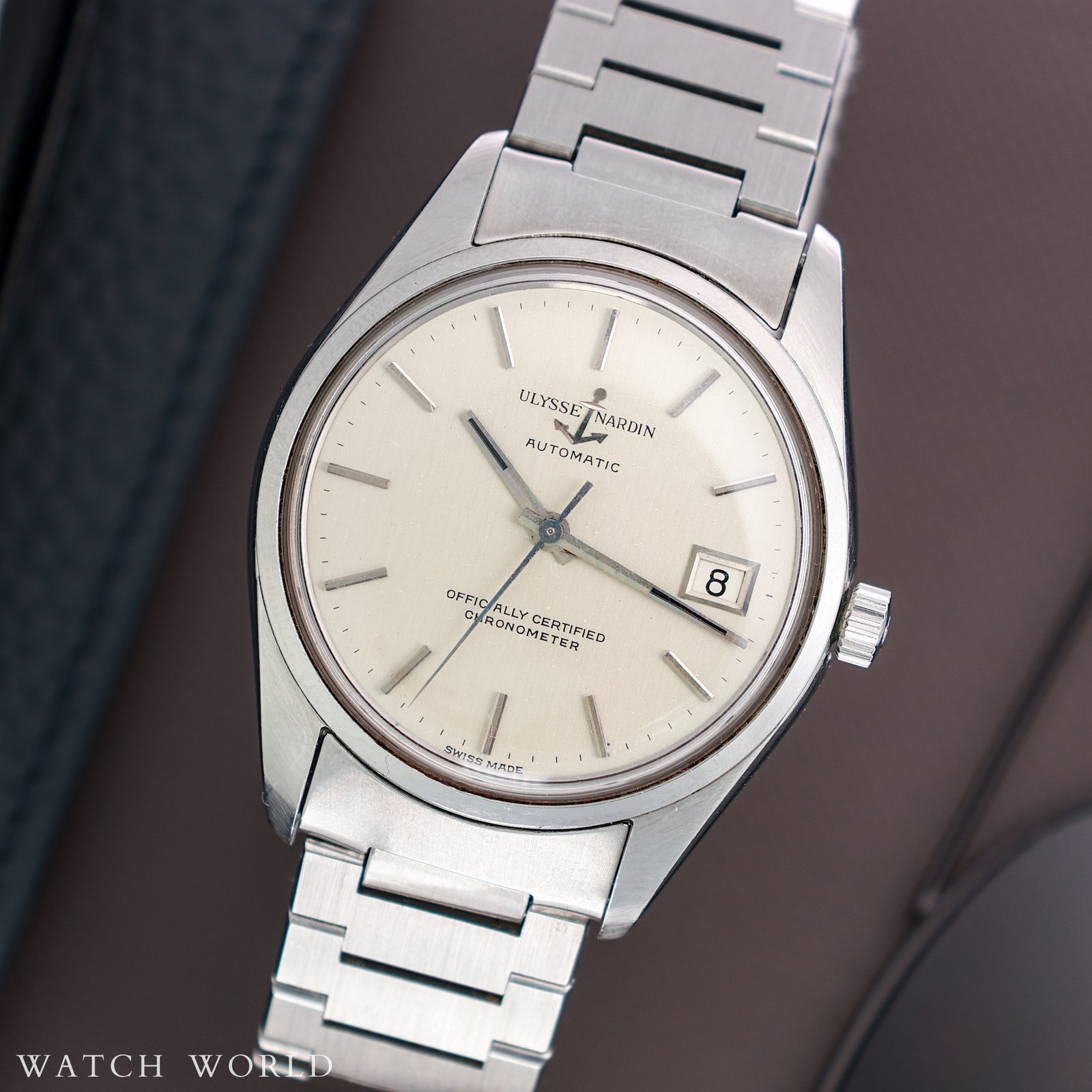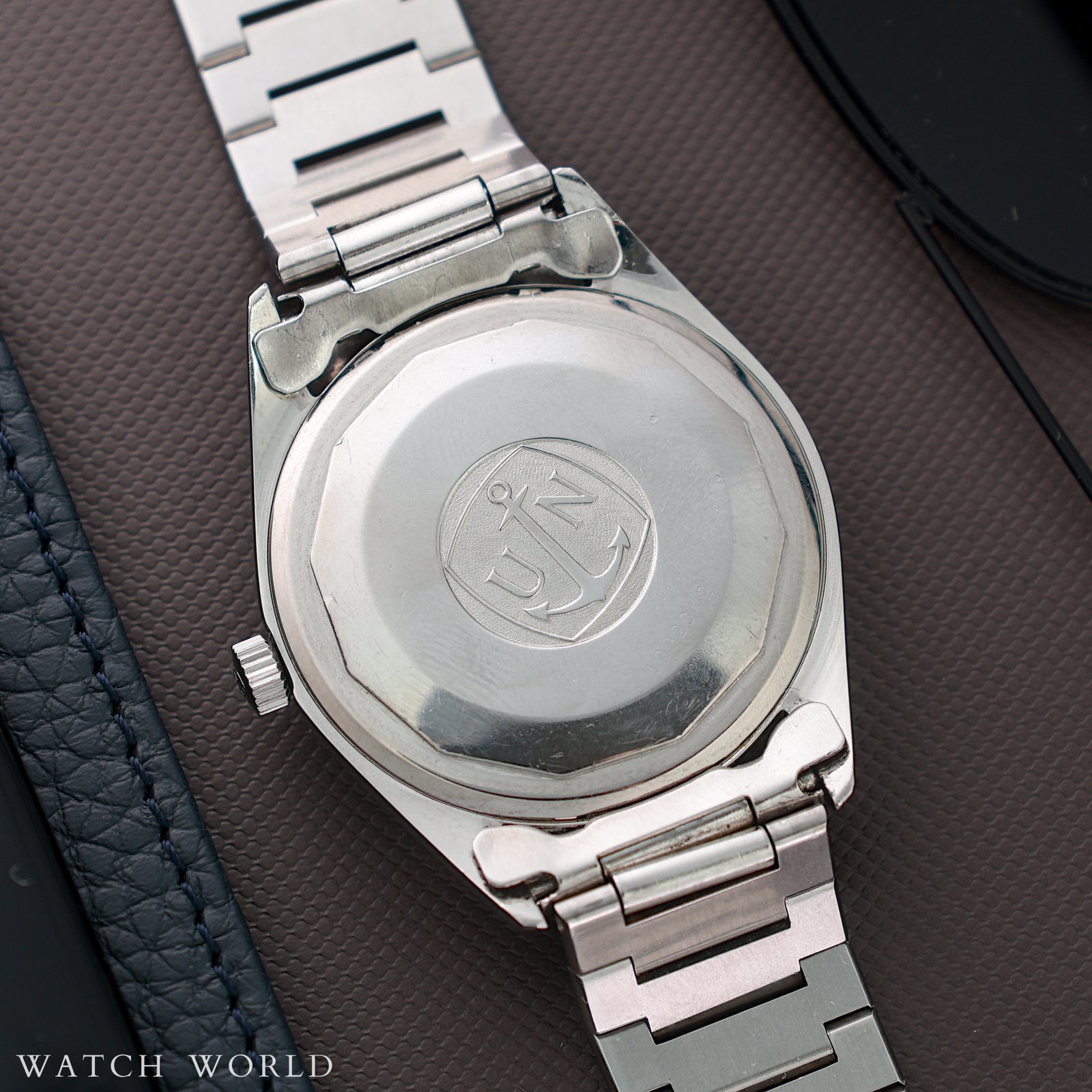 Ulysse Nardin ref.10929 cal. NH11B to ciekawy sportowy model od uznanego szwajcarskiego producenta Ulysse Nardin pochodzący z przełomu 60 i 70 lat. Zegarek wyróżnia się większą kopertą w rozmiarze 36mm oraz oryginalną bransoletą o całkowitej długości około 17.5cm. Logowana klamra z charakterystycznym znakiem kotwicy. Całość do dziś dzień zachowała się w nieprzeciętnie dobrej kondycji, oryginalne szlify koperty, oryginalna logowana koronka, oryginalne szkło. Tarcza z niewielkimi śladami starzenia, każdy element zegarka odpowiada fabrycznemu oryginałowi. W środku pracuje mechanizm NH11B z centralną sekundą oraz funkcją daty, certyfikowany na najwyższą precyzję chronometr. Mechanizm jest po pełnym serwisie zegarmistrzowskim. Zegarek objęty jest 12 miesięczną gwarancją oraz dostarczany z firmowym etui podróżnym WatchWorld. Jest to prawdziwa kolekcjonerska perełka, która poprzez niewielką ilość wyprodukowanych sztuk w dzisiejszych czasach jest wyjątkowa ceniona.