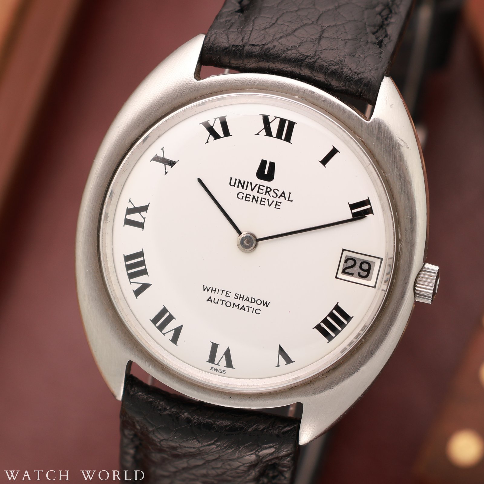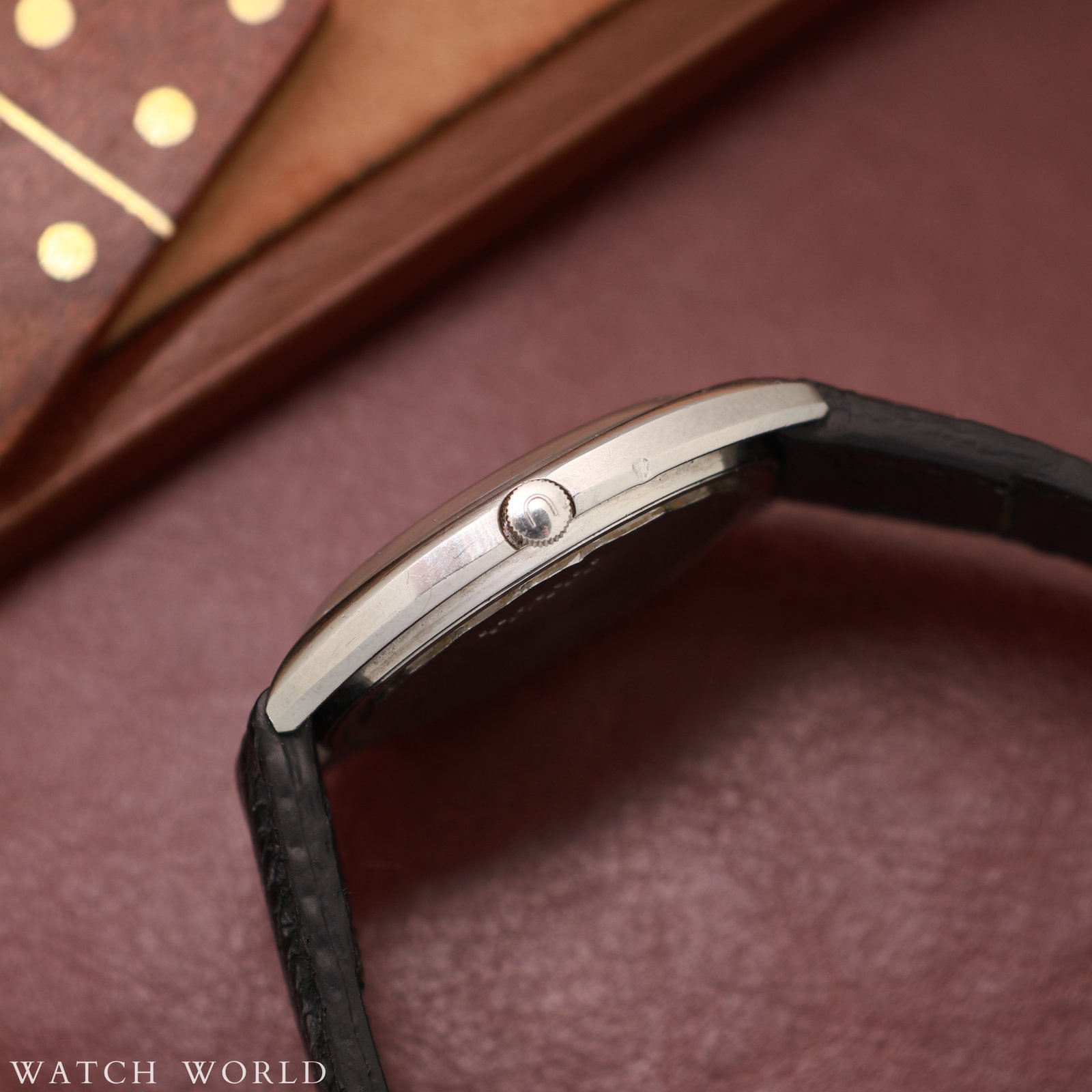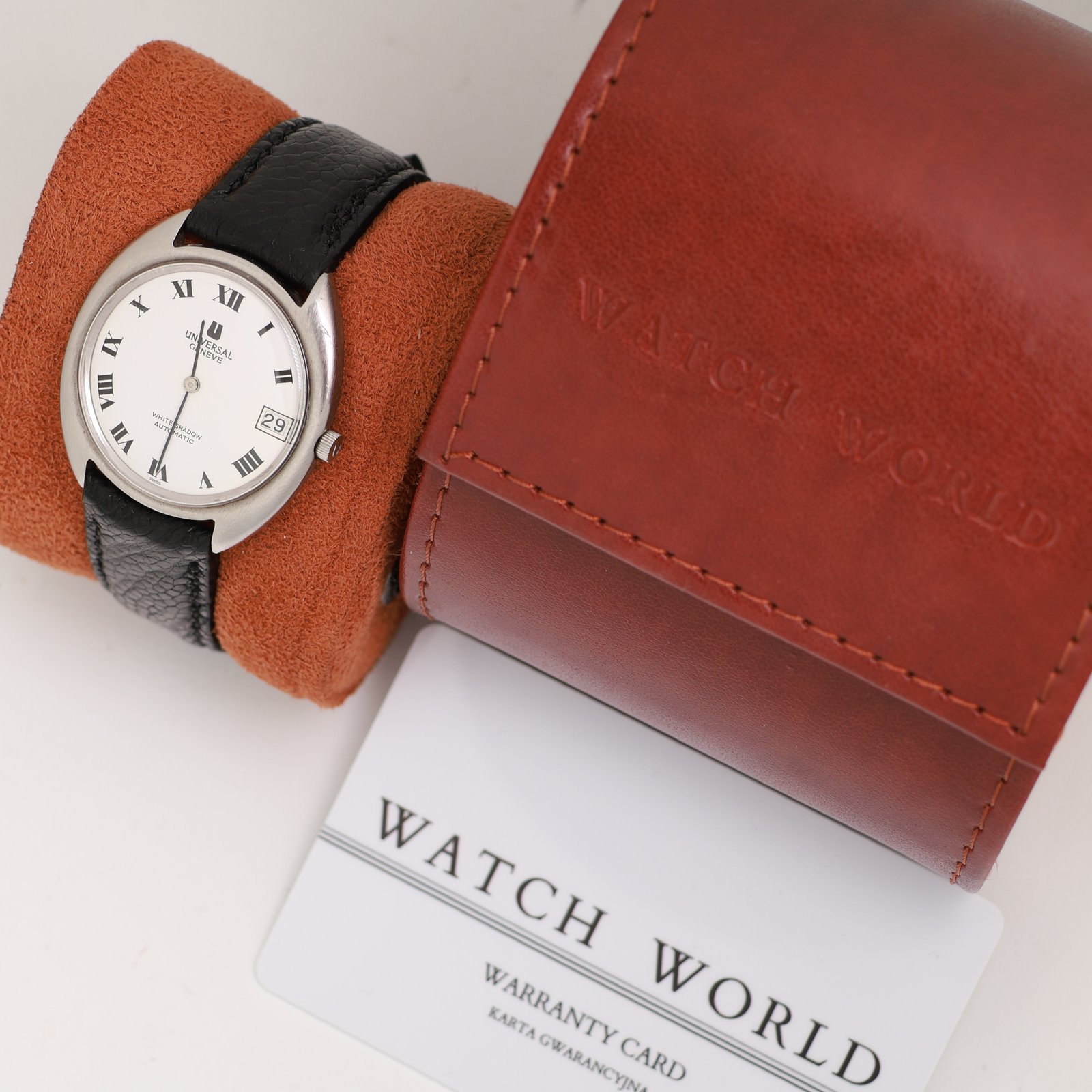 Universal Geneve 867102 Micro Rotor to zegarmistrzowskiej innowacyjności lat 70. Zegarek został zaprojektowany przez jednego z najlepszych projekantów – Geralda Genty, łączy w sobie wysmakowaną stylistykę z unikalnym mechanizmem micro-rotor, co daje mu niezwykle smukły profil. Koperta wykonana ze stali szlachetnej ma zaledwie 7.5mm grubości. Całość dopełnia piękna emaliowana tarcza z rzymskimi indeksami, oraz logowane oryginalne szkło i koronka. W sródku pracuje automatyczny kaliber 2-67 wyjątkowy dzięki miniaturowemu wachnikowi umieszczonemu w płycie zegarka, świeżo po pełnym serwisie zegarmistrzowskim, objęty 12 miesięczną gwarancją. Zegarek oferowany jest z nowym, ręcznie robiony paskiem oraz dostarczony z firmowym etui podróżnym.